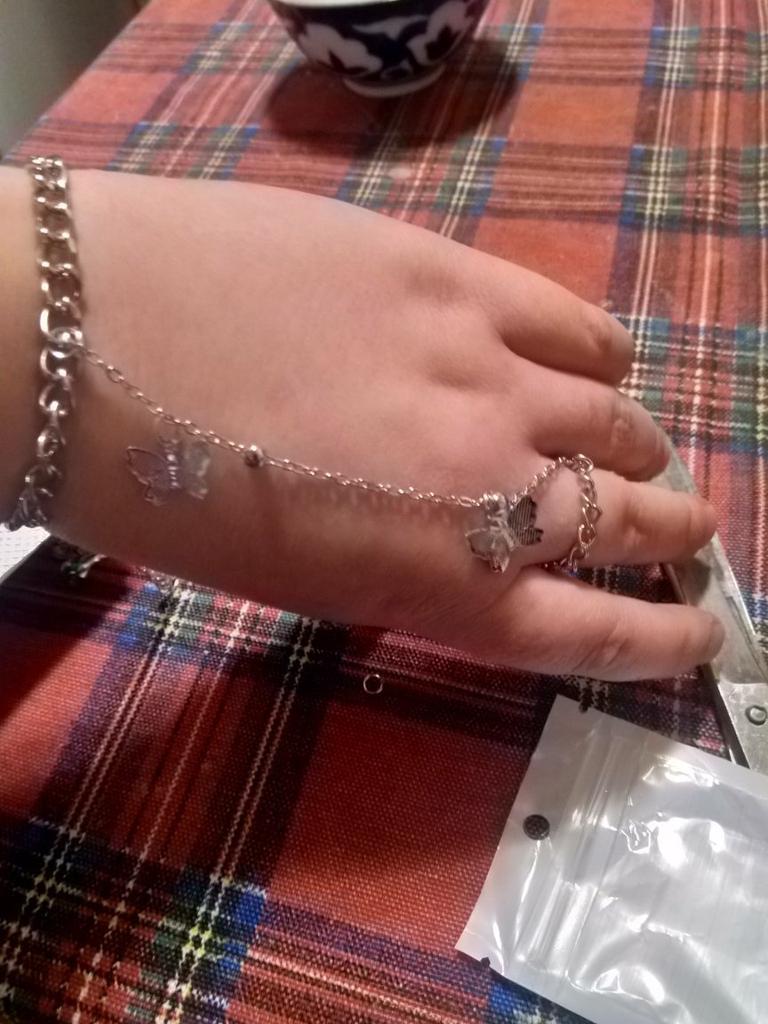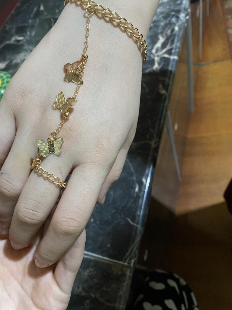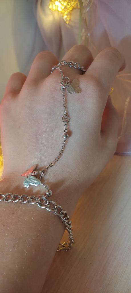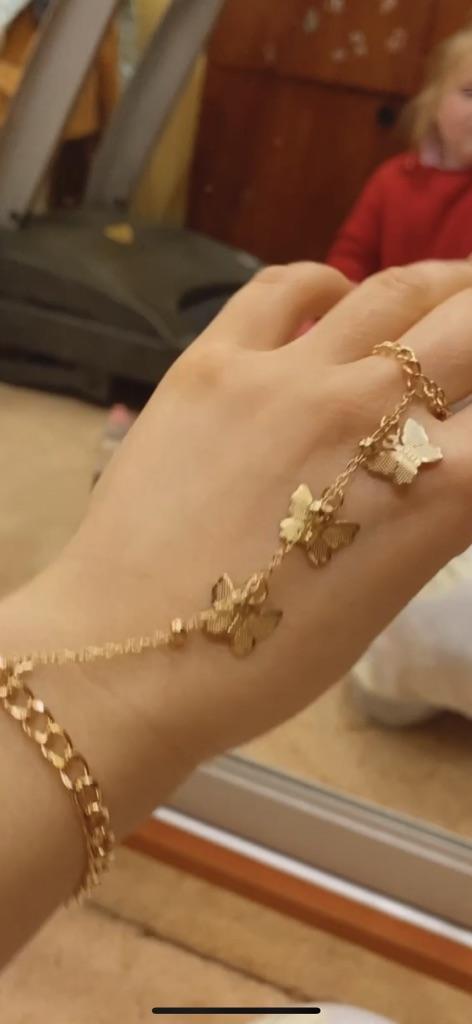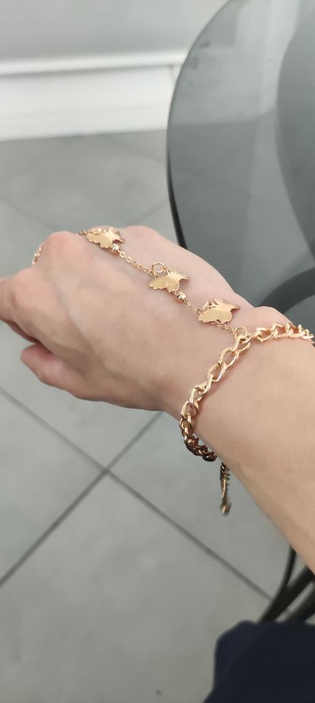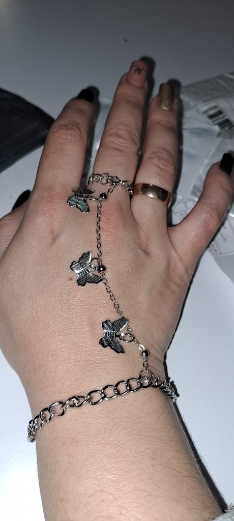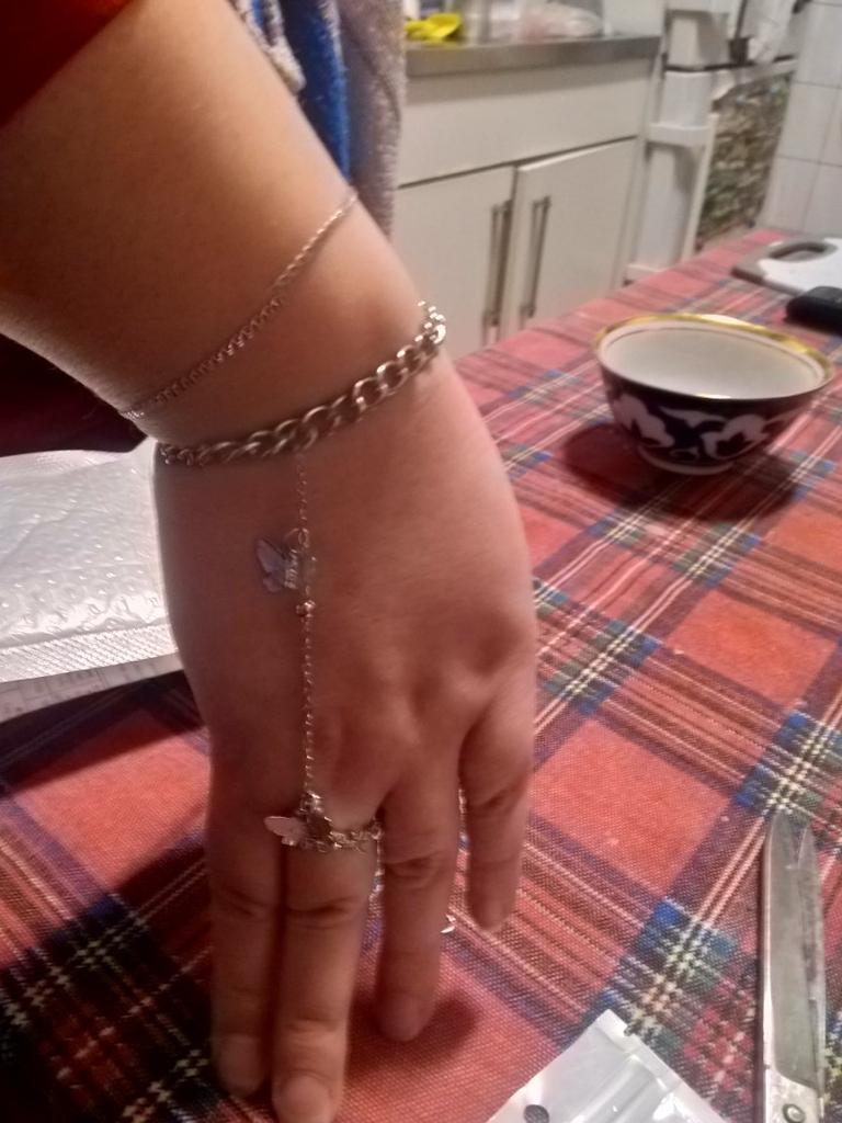 A corrente nas costas da mão é muito fina e infelizmente as borboletas parecem muito baratas. A corrente ao redor do dedo é muito pequena para o dedo médio, onde realmente pertence uma pulseira de barata.
