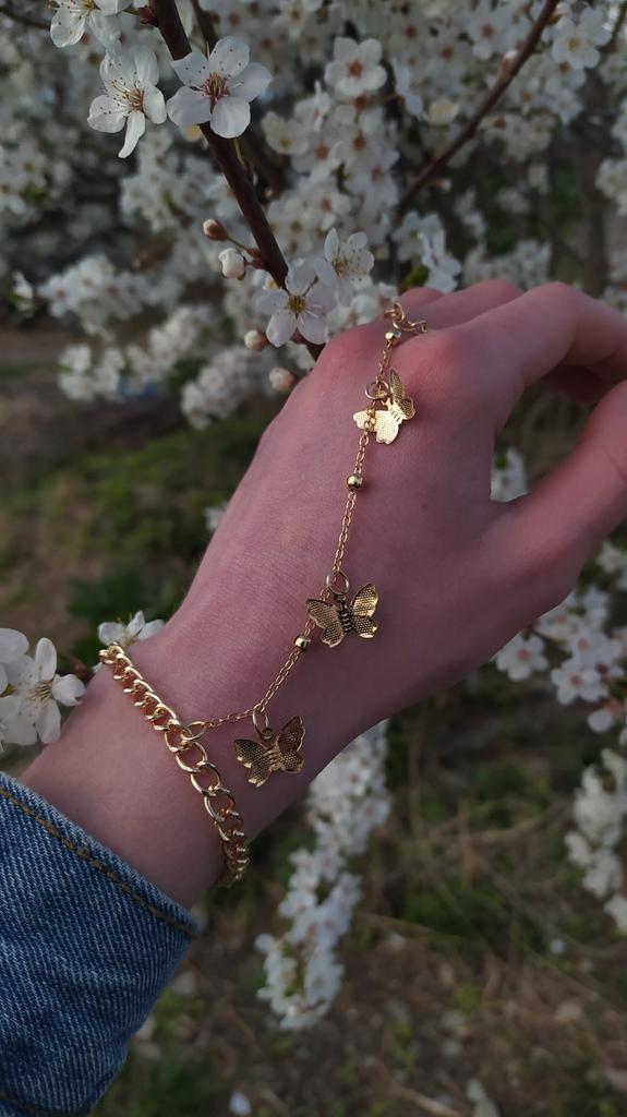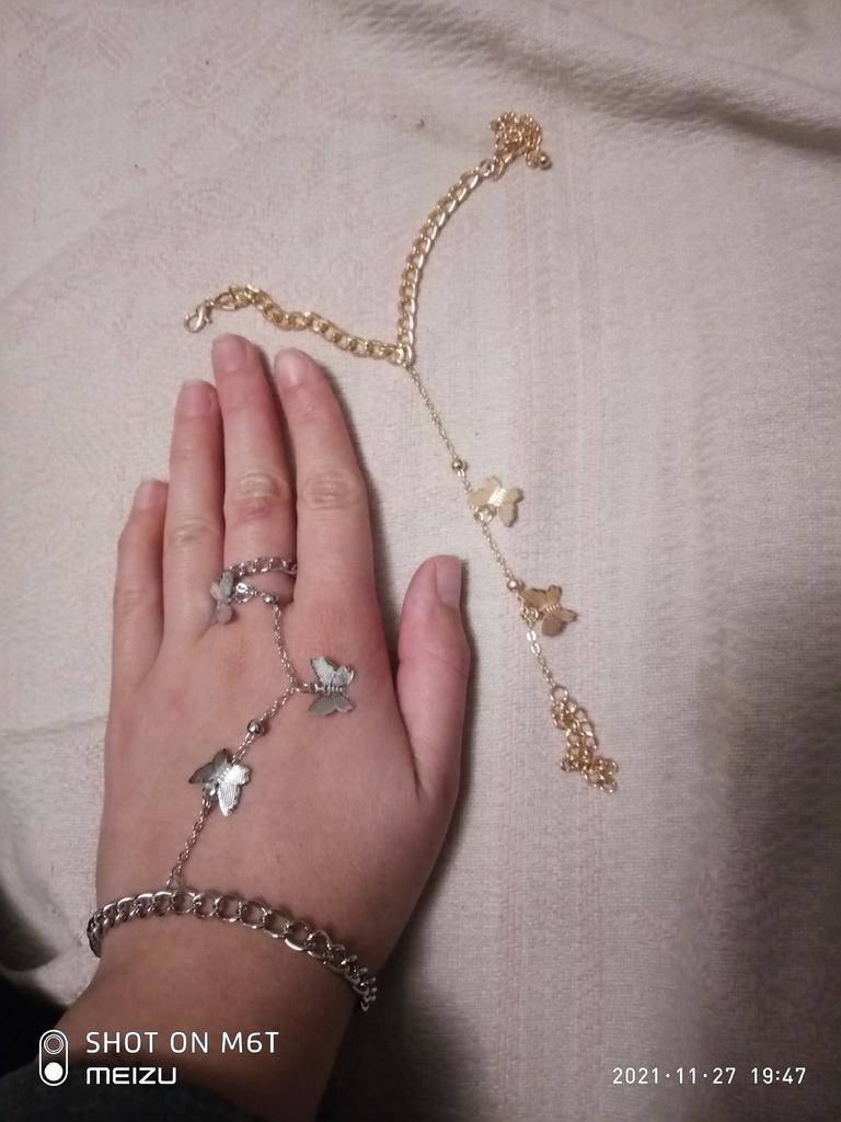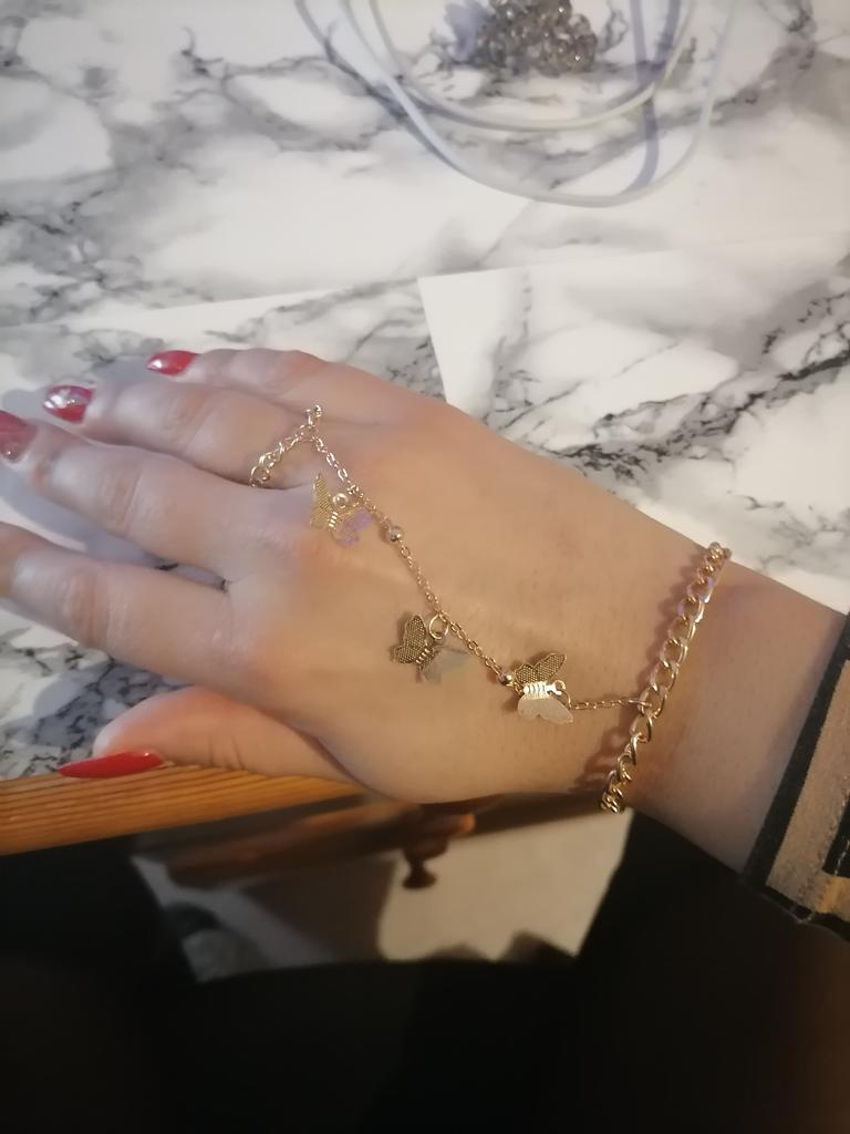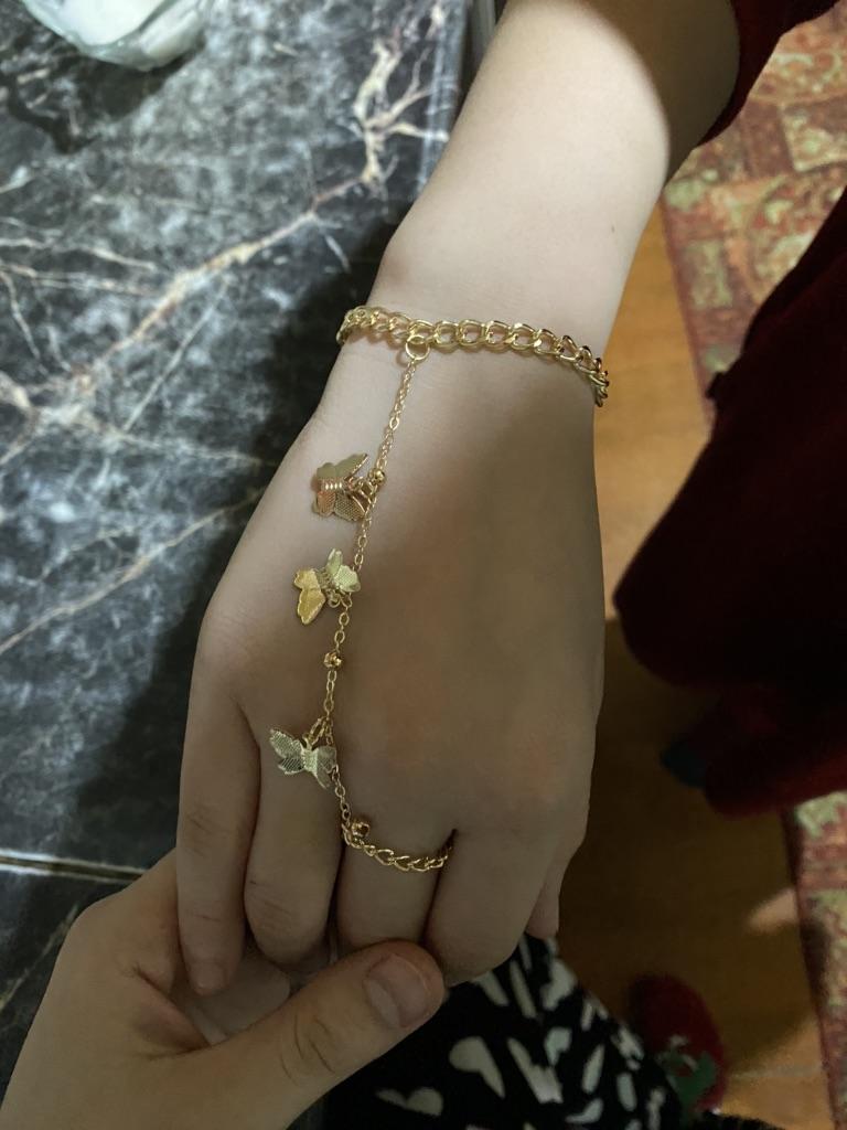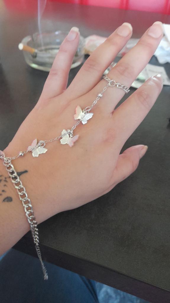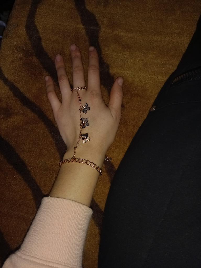 A corrente nas costas da mão é muito fina e infelizmente as borboletas parecem muito baratas. A corrente ao redor do dedo é muito pequena para o dedo médio, onde realmente pertence uma pulseira de barata.