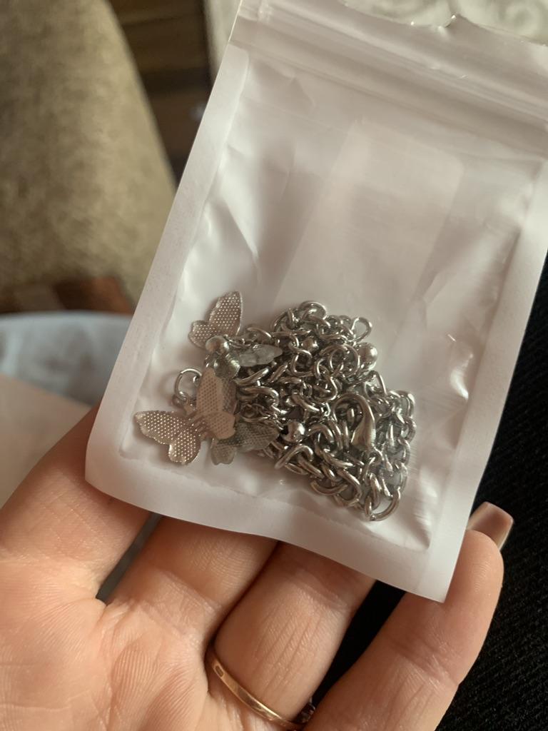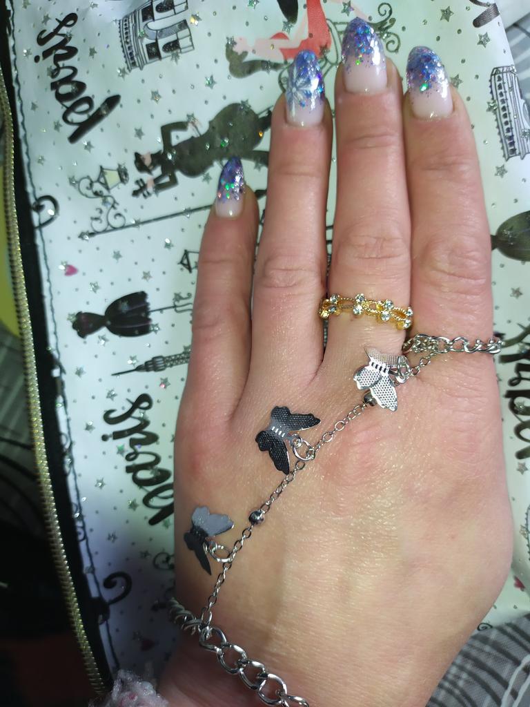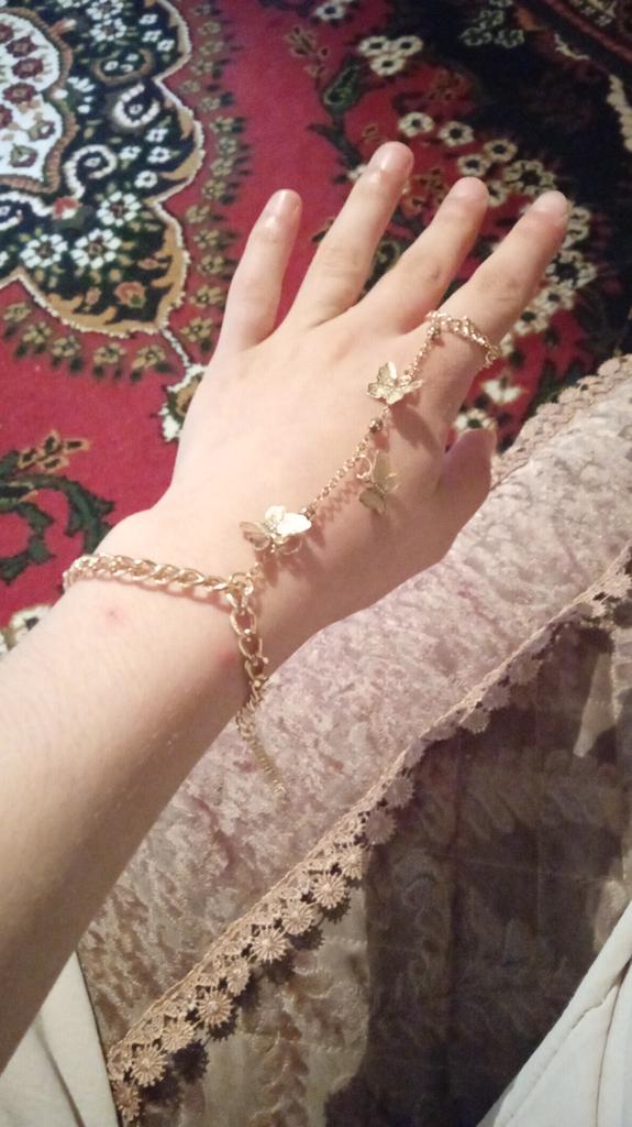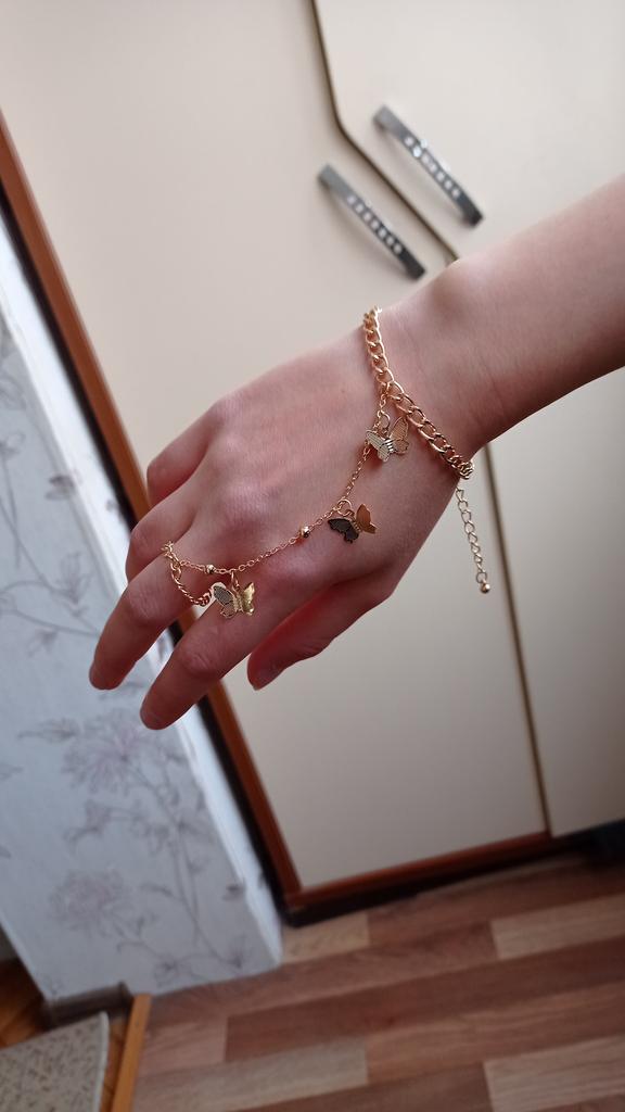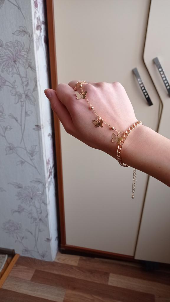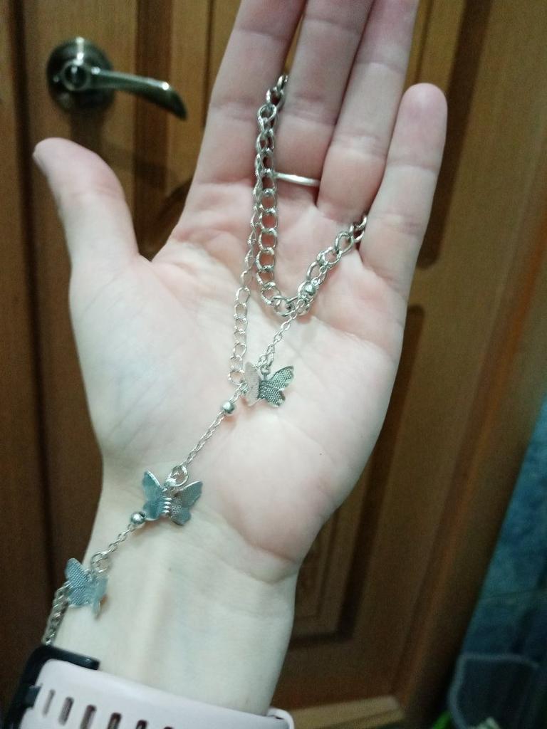 A corrente nas costas da mão é muito fina e infelizmente as borboletas parecem muito baratas. A corrente ao redor do dedo é muito pequena para o dedo médio, onde realmente pertence uma pulseira de barata.
