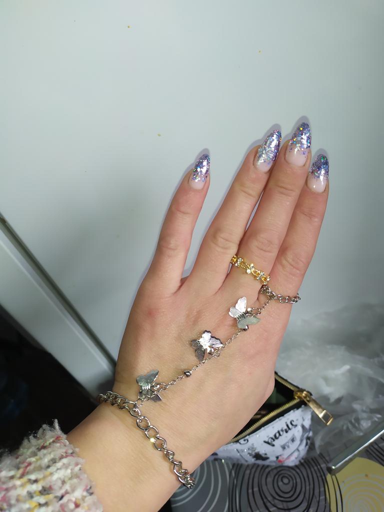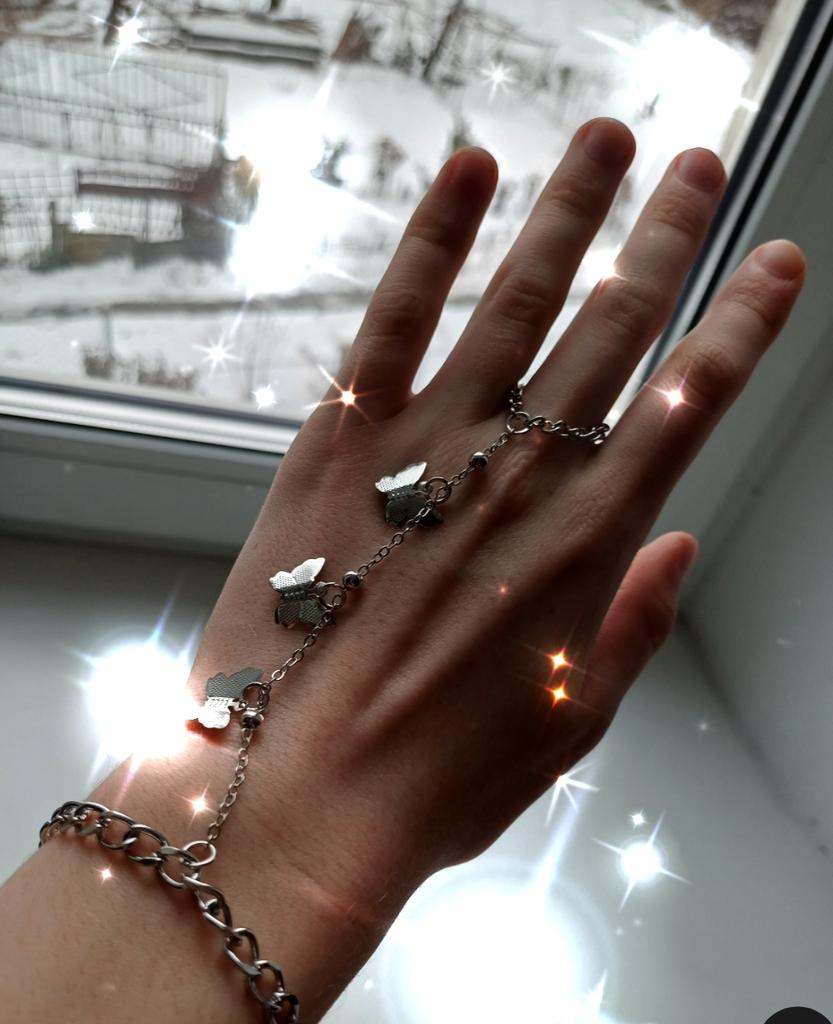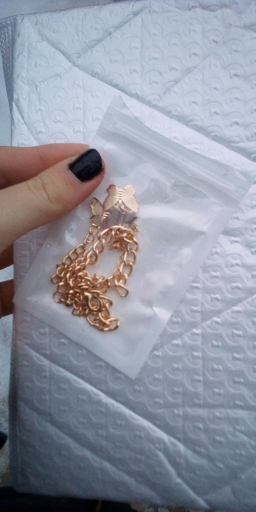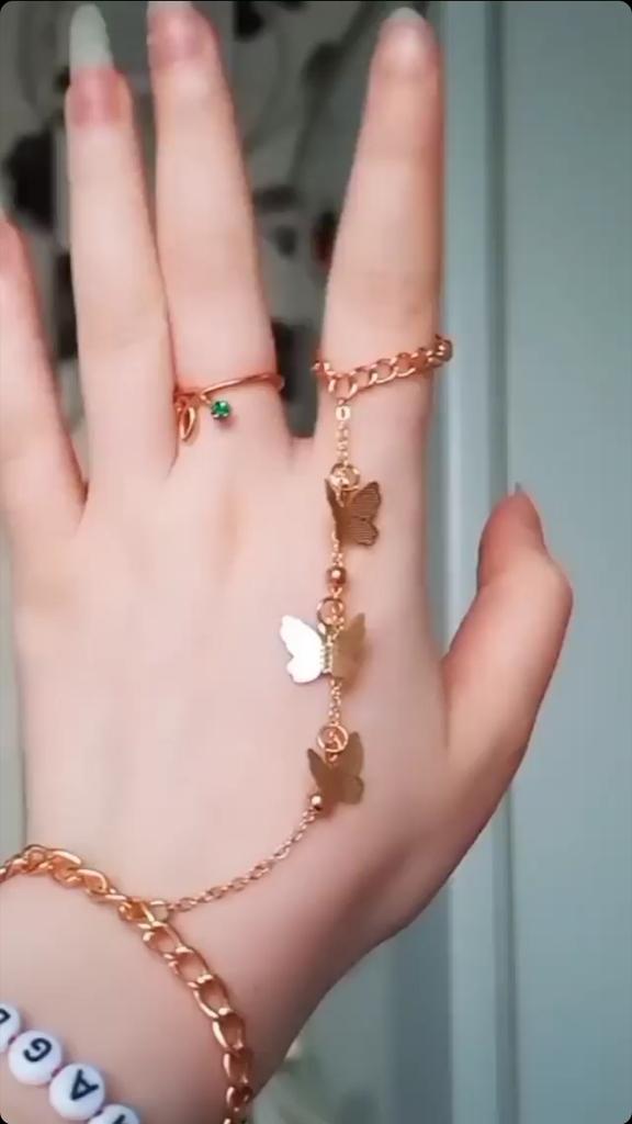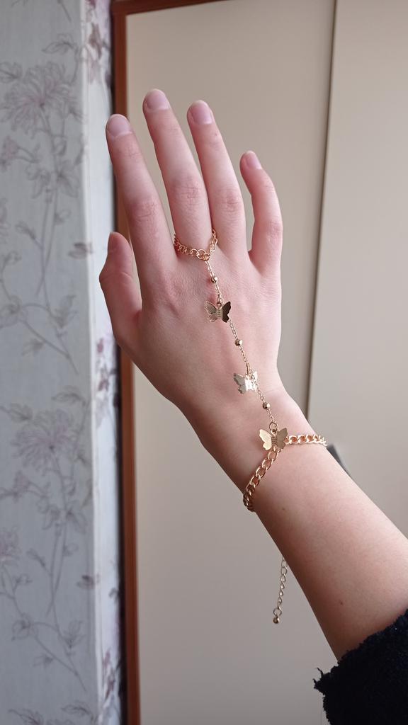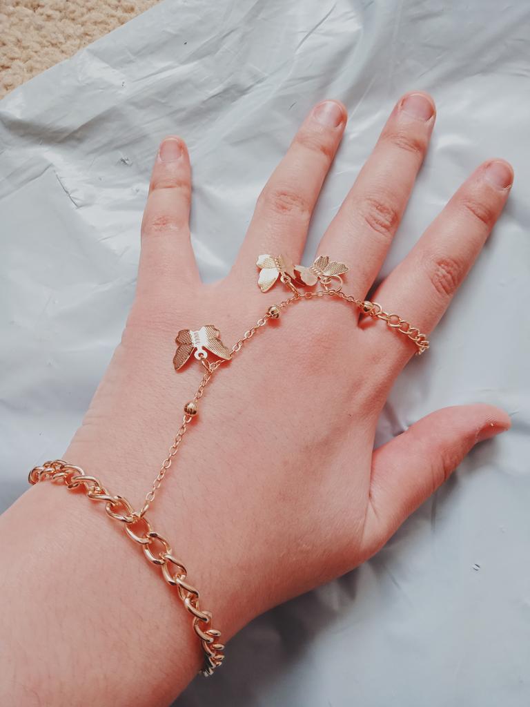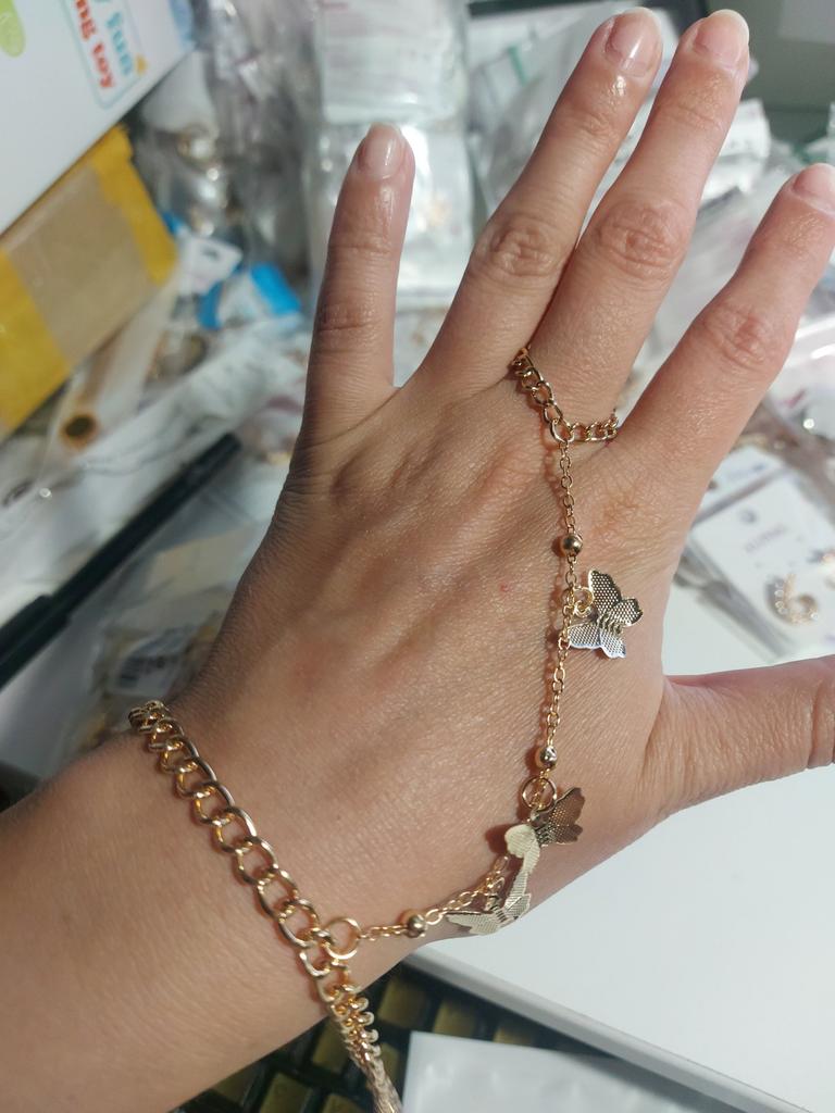 Pulseira de mão com borboletas. A pulseira chegou rapidamente em um envelope de plástico. A qualidade é média. Possui 1 fecho no pulso. primeiro é necessário colocá-lo no dedo médio e depois prendê-lo no pulso. Tem 3 borboletas no meio, que ficam lindas, mas de perto dá pra ver que é só uma folha fina que se dobra com facilidade. Parece bom na mão e é decente para o preço.