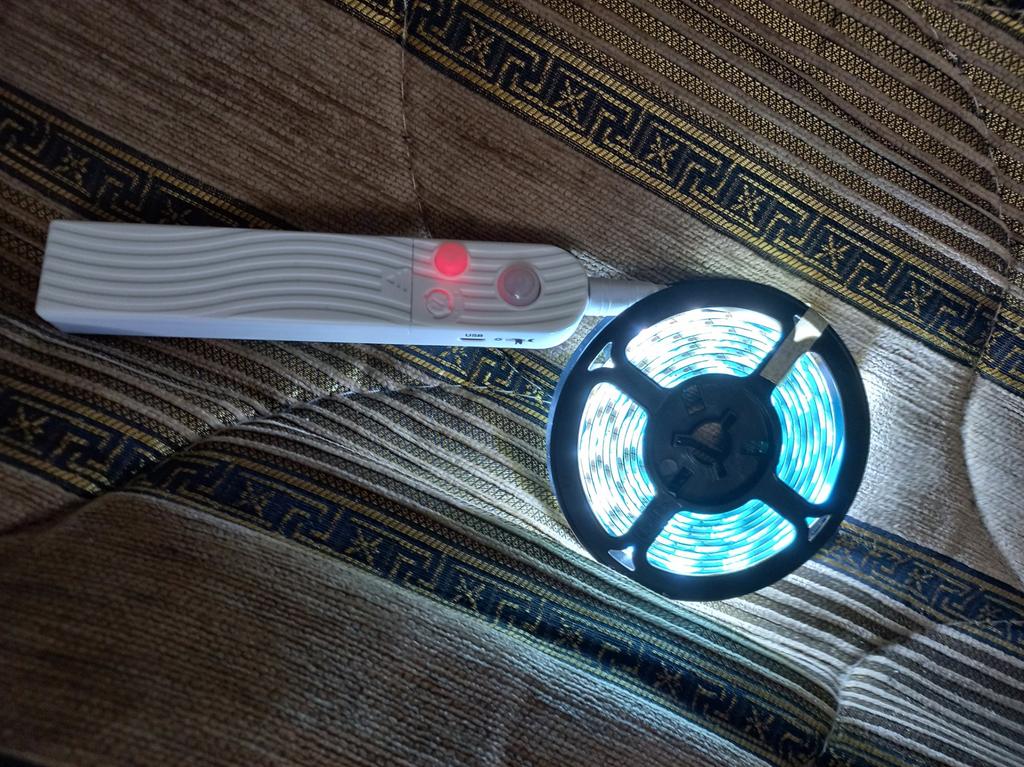Bela faixa LED multifuncional. Pode funcionar com baterias ou em rede através de um cabo micro USB (não incluído). Pode funcionar constantemente ou ser ligado por um sensor de movimento.