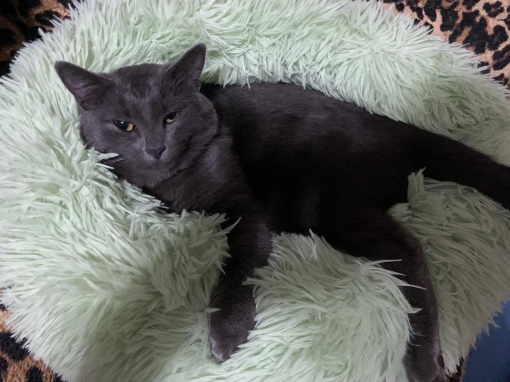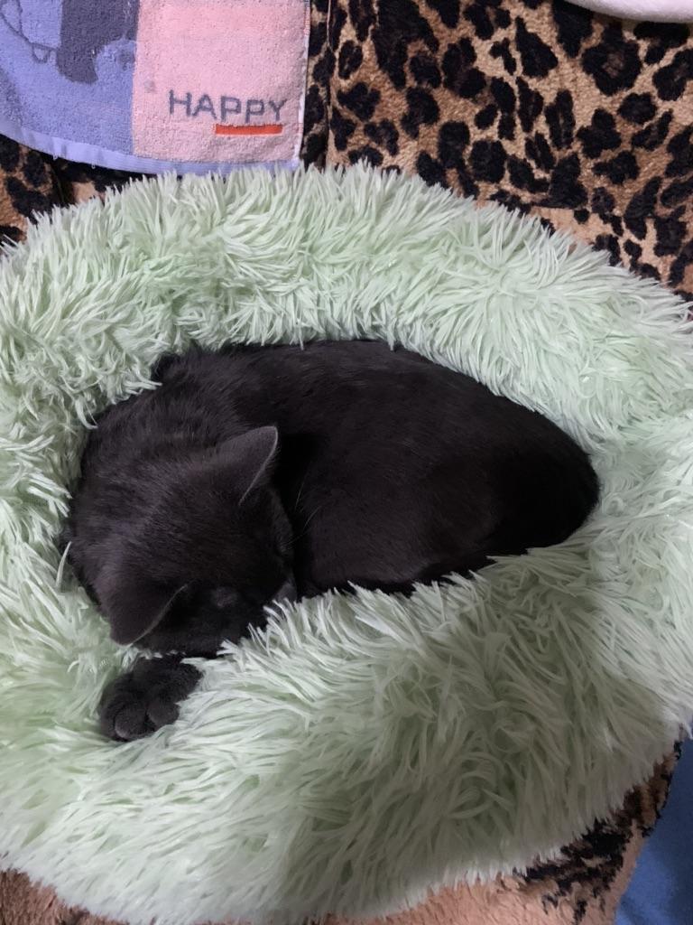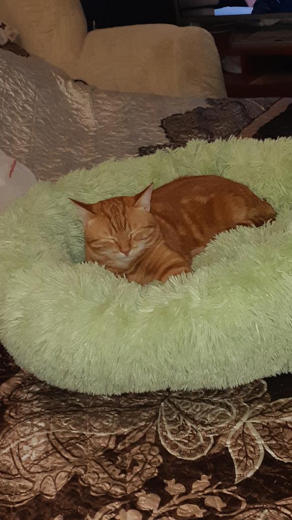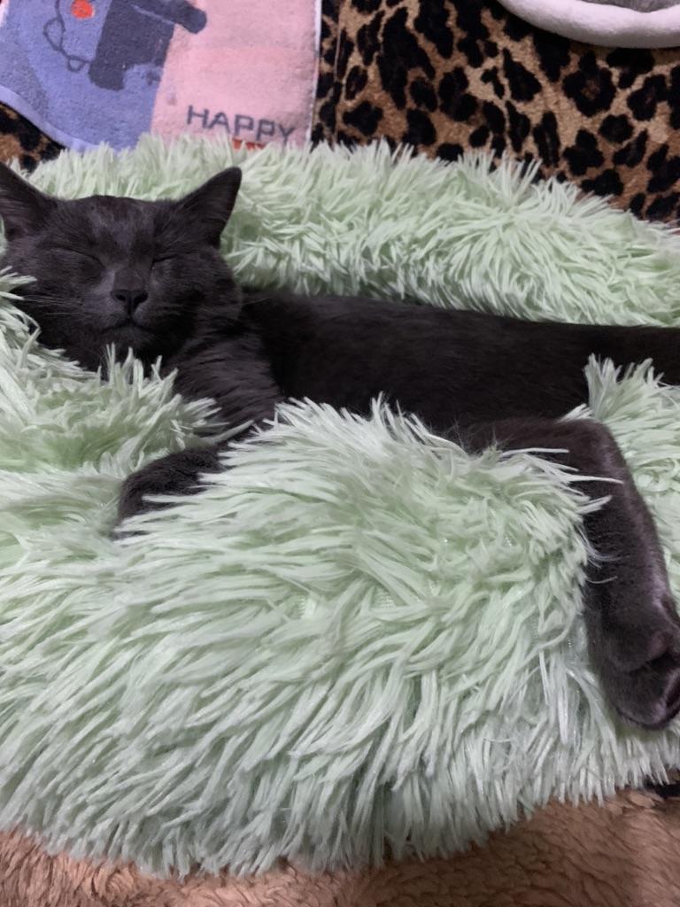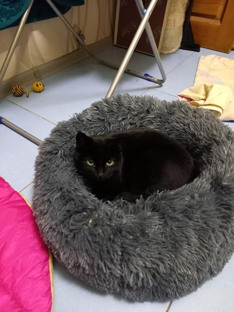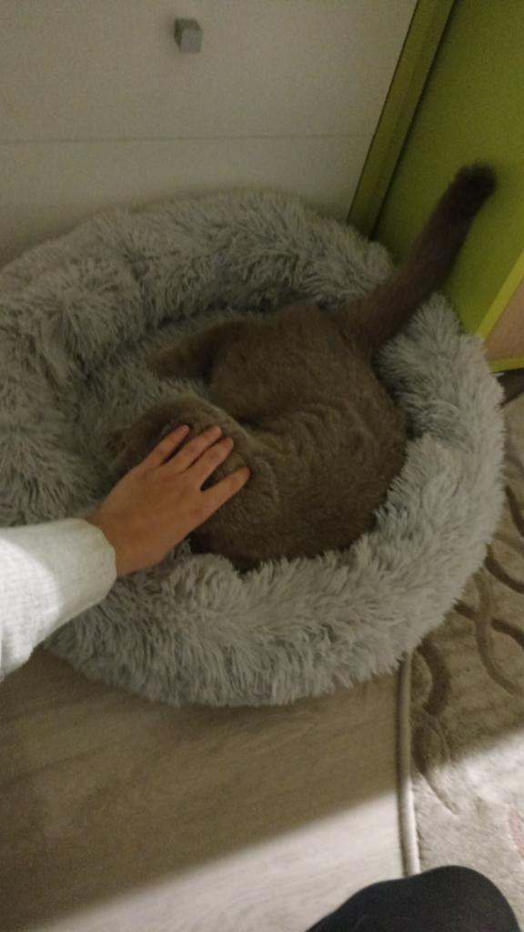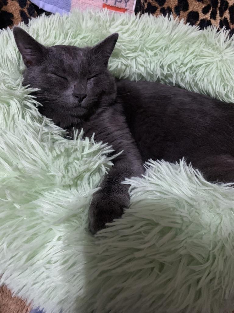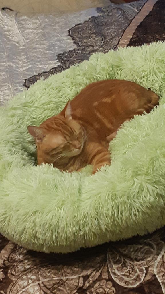 meu gato imediatamente deitou na cama fofinha e ronronou feliz