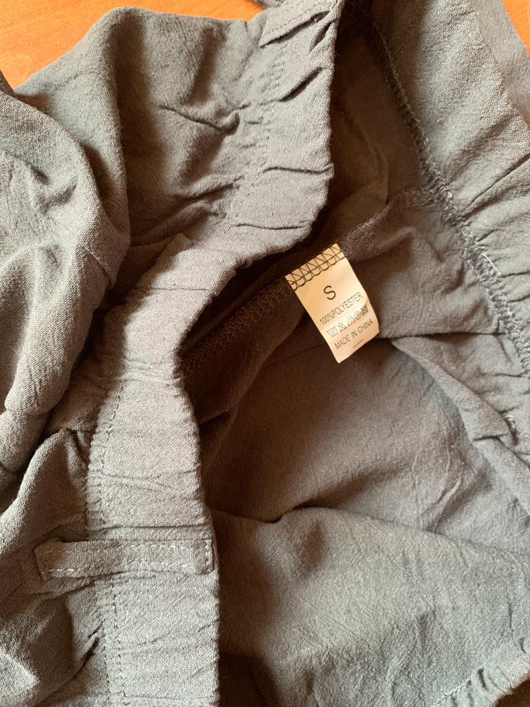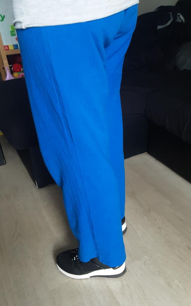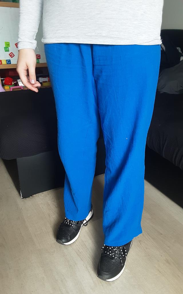 As calças não são de poliéster puro, são 65% algodão e isso é muito legal. Foi um erro eu ter pedido S, precisava de M ou L para que ficassem bem soltas.