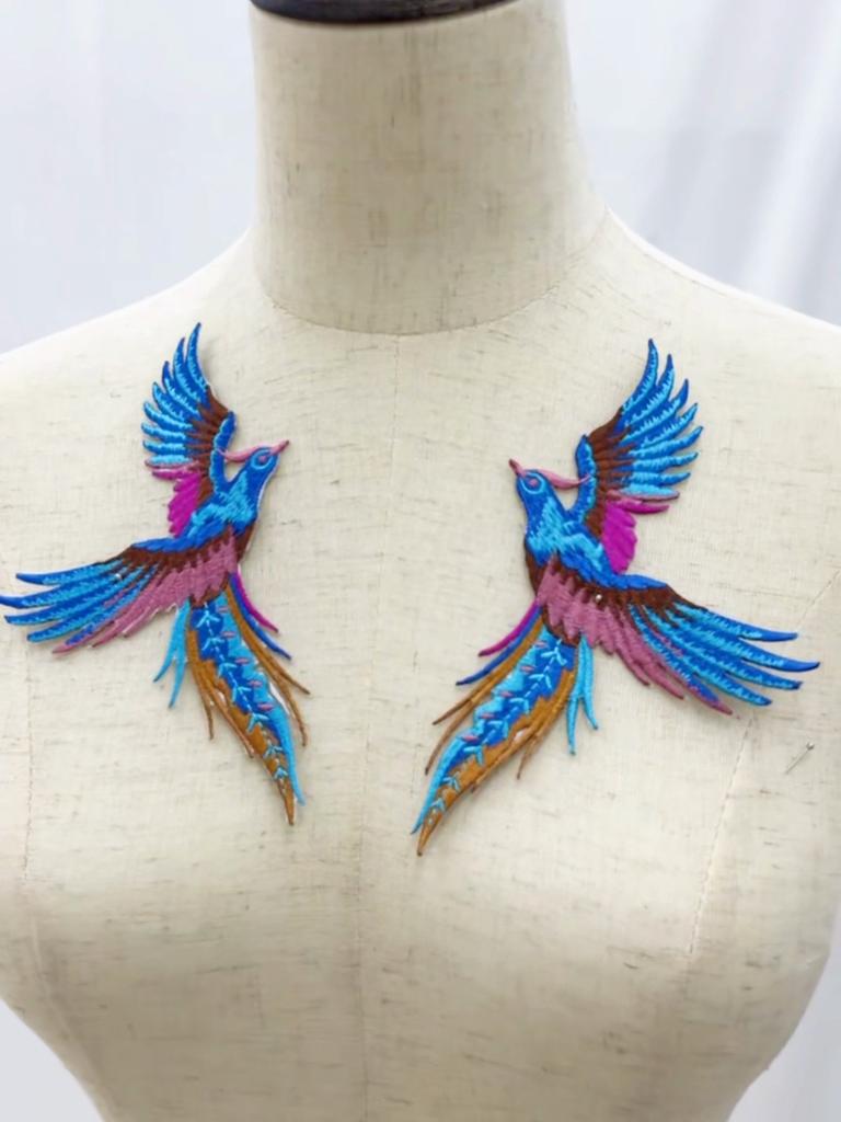 Par de patches bordados com ferro de passar roupa Phenix Birds Azul Azul Rosa Dourado