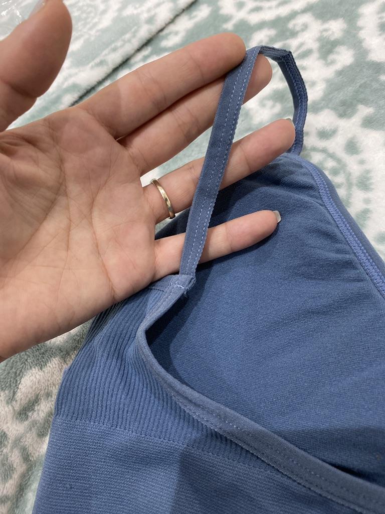 Material elástico. Ótimo ajuste. O top tem costas baixas e alças finas, e acolchoado também!