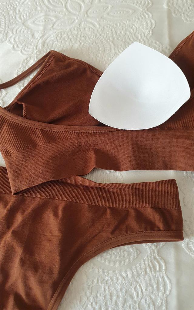 Top muito legal, a calcinha brilha. Em princípio, está tudo bem, o tamanho é ótimo, parece universal, porque se estende muito bem. Eu jogo fora a espuma imediatamente, porque é horrível nesses tops (