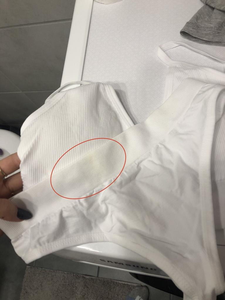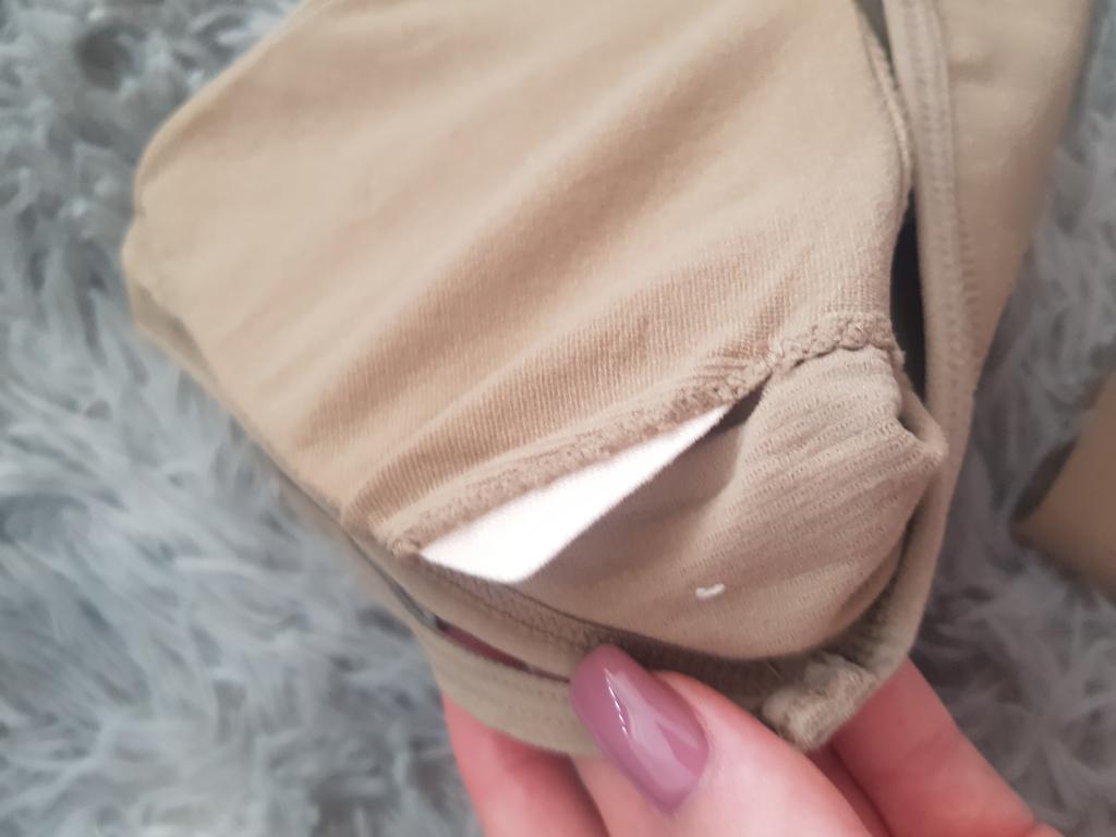 Há um cheiro levemente desagradável de tecido sintético, acho que desaparecerá após a lavagem. A parte superior veio suja por um lado, não tenho certeza do que foi lavado. E no elástico da calcinha algumas manchas amarelas :( Paralon em copas é muito iluminado, é melhor usar sem ele. Fica bem no corpo, mas esses contaminantes estragaram a impressão. Eu não pediria tais mercadorias novamente.