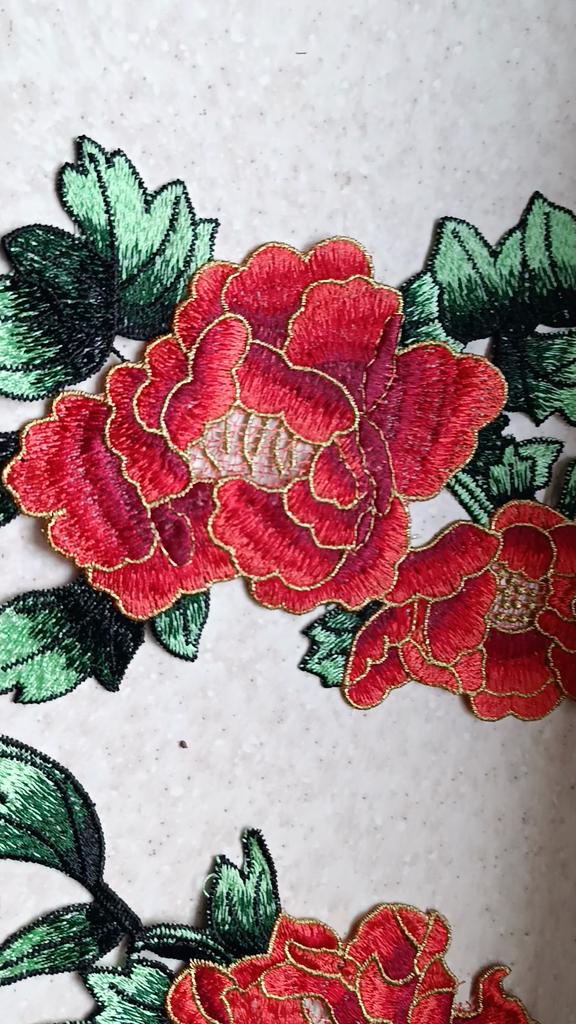 Lindo aplique. As flores são enfeitadas com fios de ouro. Brilhante, lindo. A cor é vermelha.