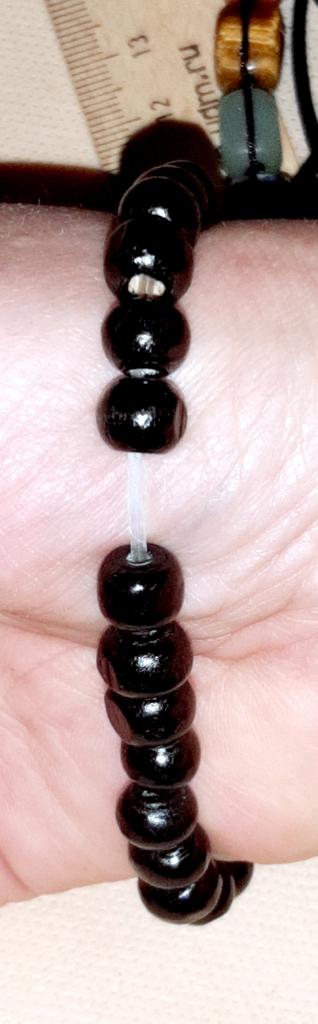 Levei para reforma, as contas não são shungite, mas sim madeira, o interior não é pintado. O oito é feito de metal - arranhei para verificar: é leve demais para metal. Provavelmente é plástico com revestimento de metal.