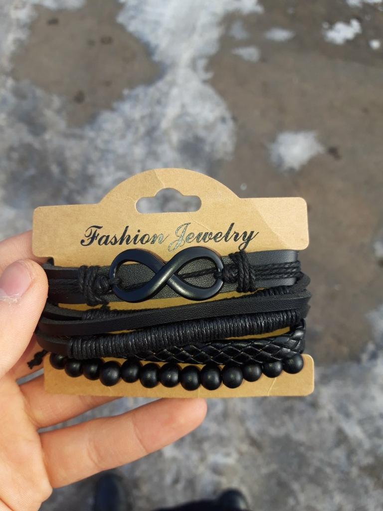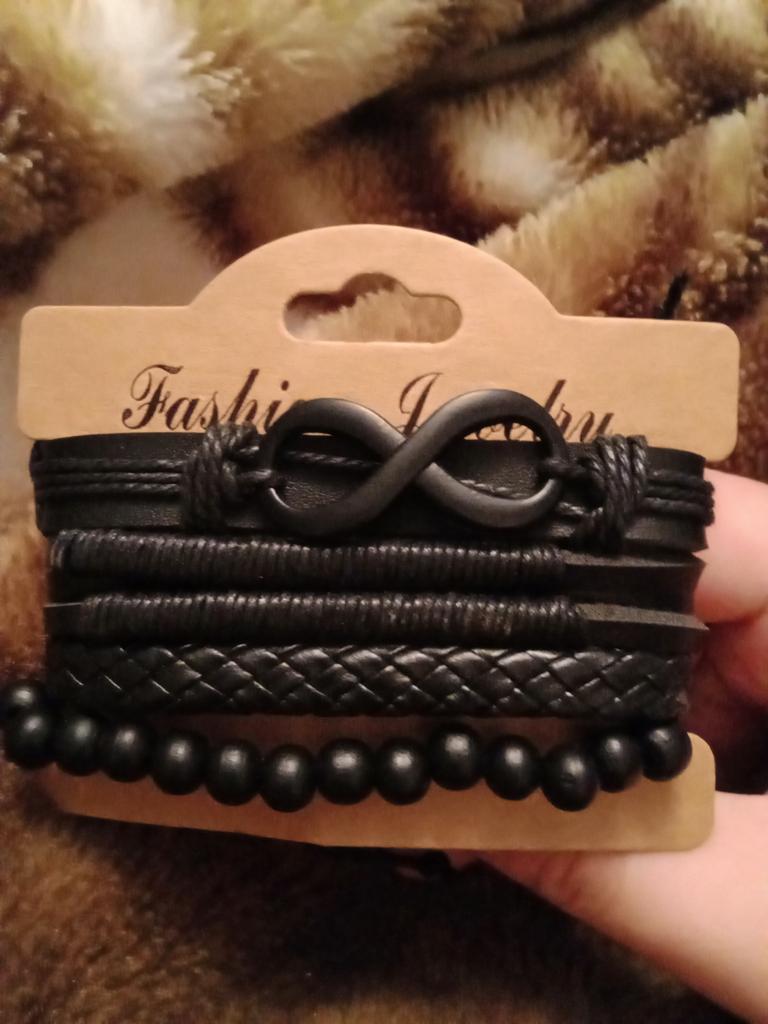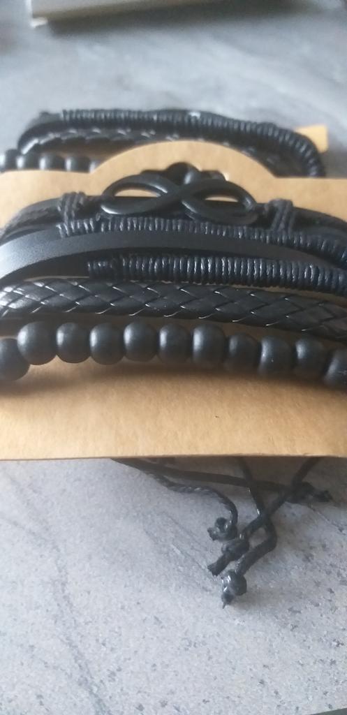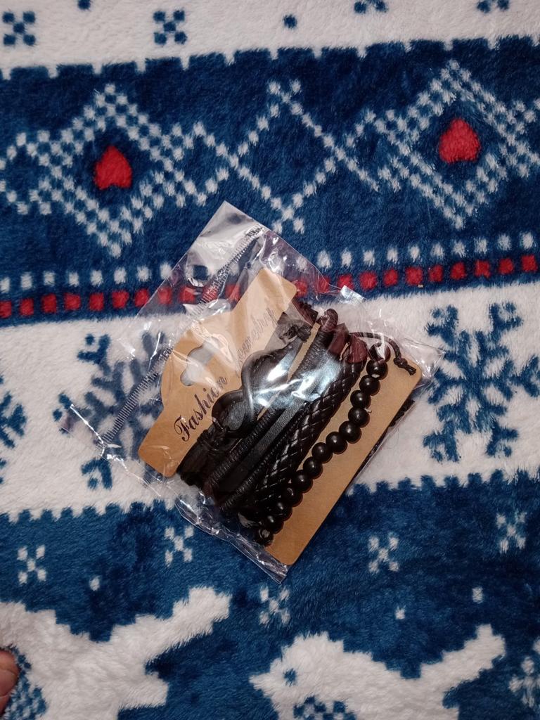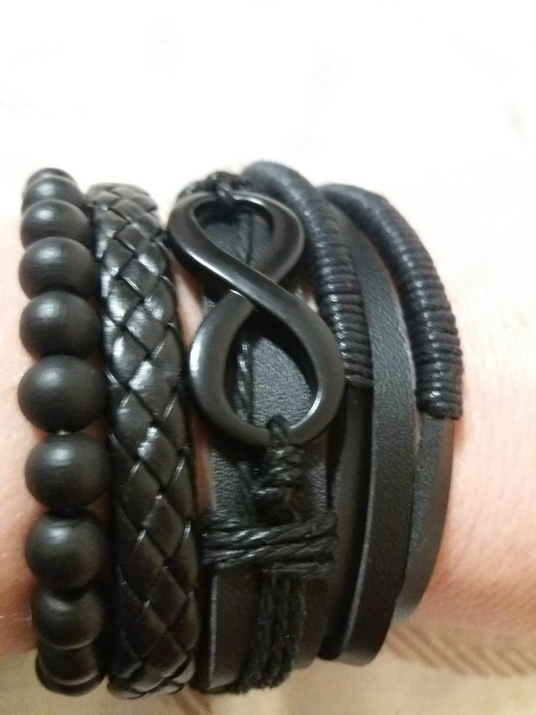 Três pulseiras de couro e 1 conta de madeira em um elástico. Eu gostei deles. Eu recomendo