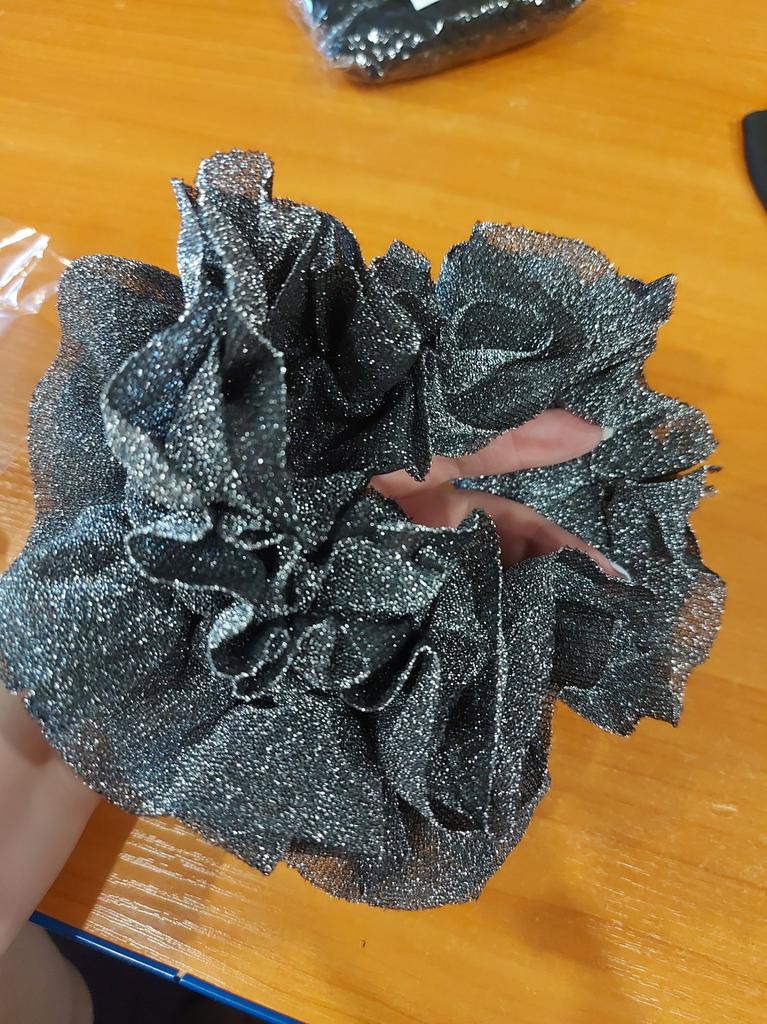 Os glitter do tecido caem muito. Rosto, mãos, roupas - tudo brilha😆, o próprio elástico segura muito bem o cabelo, tanto o fino quanto o grosso)