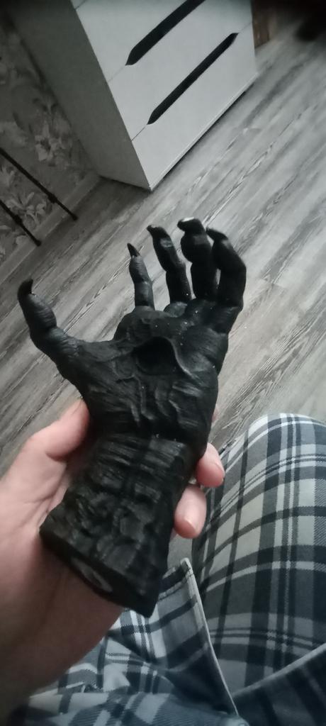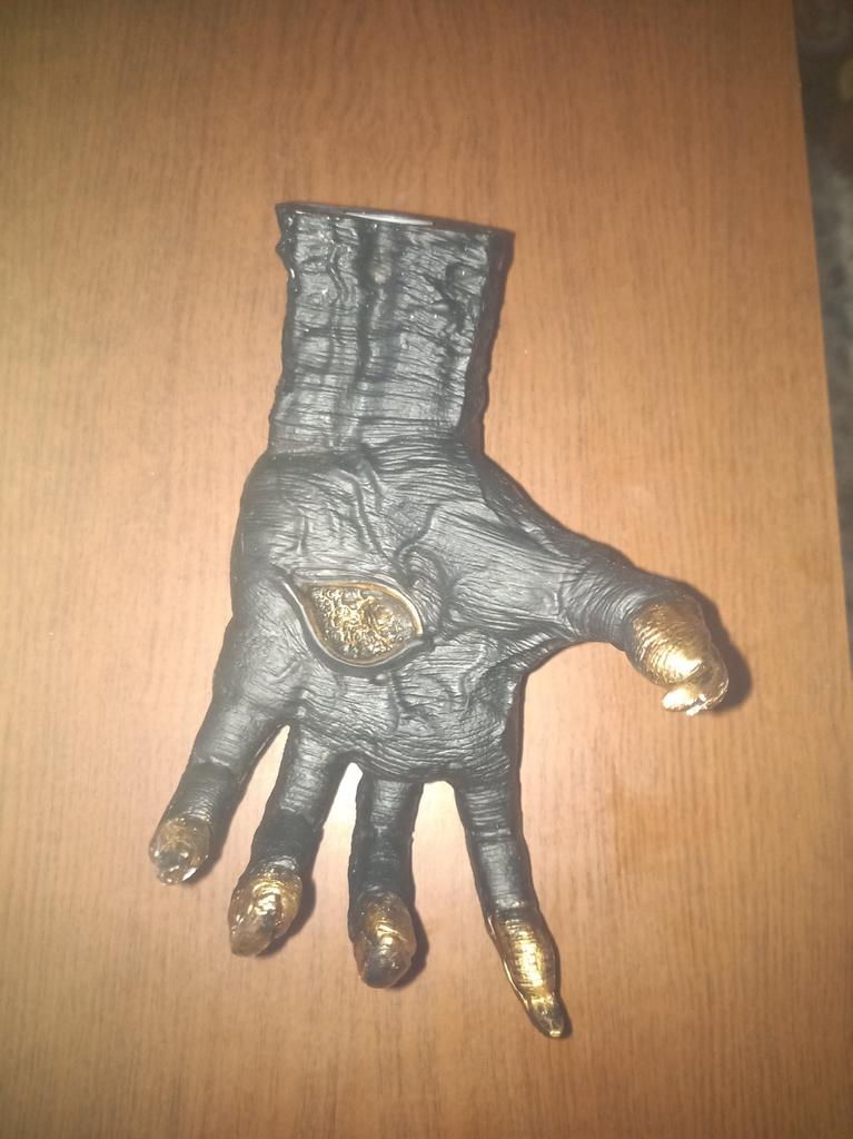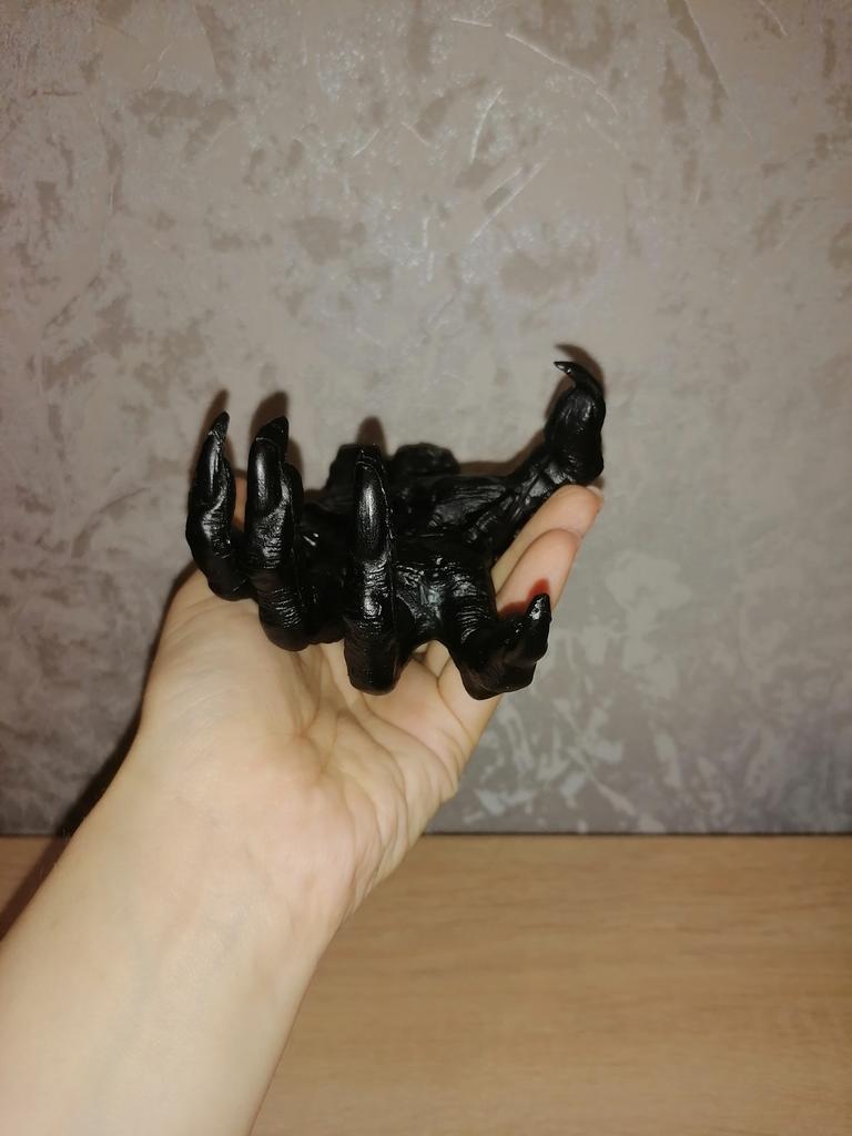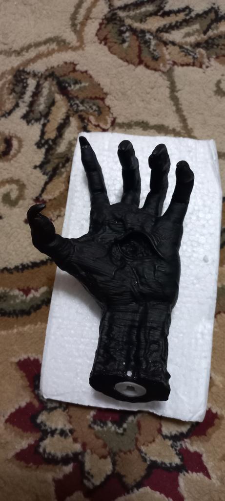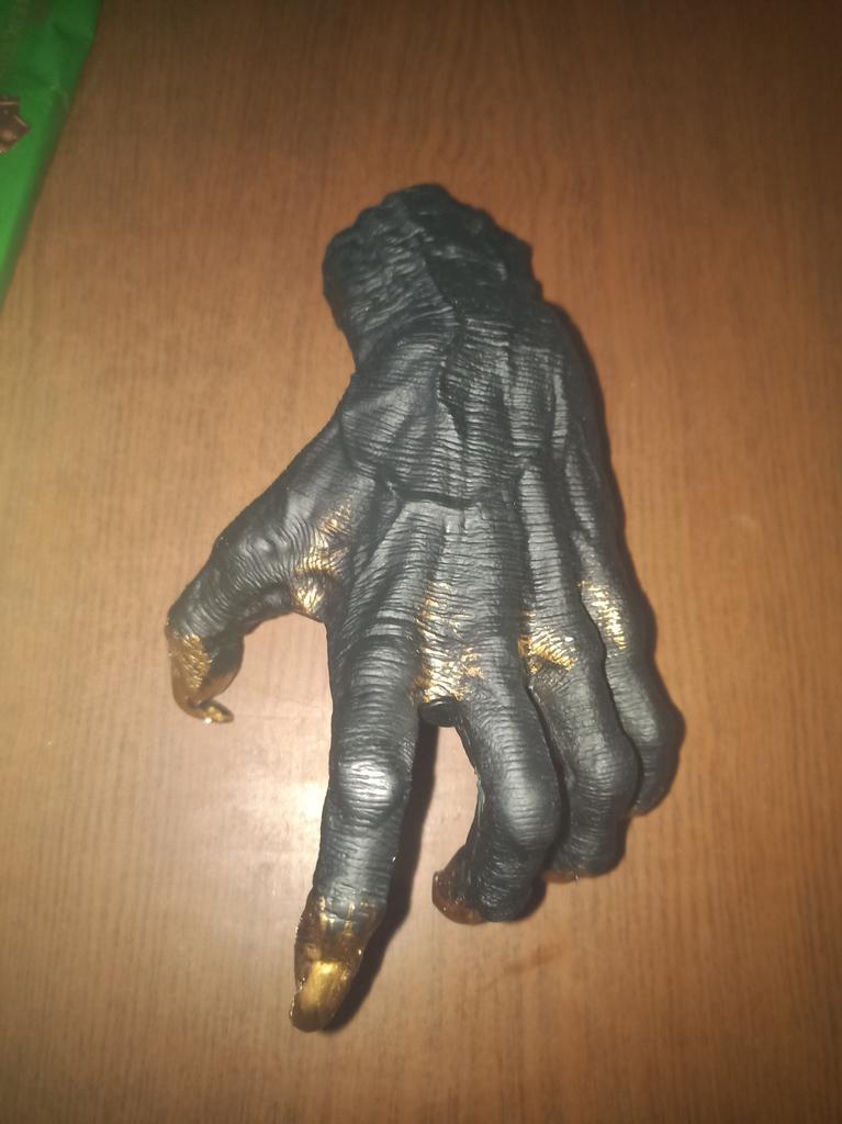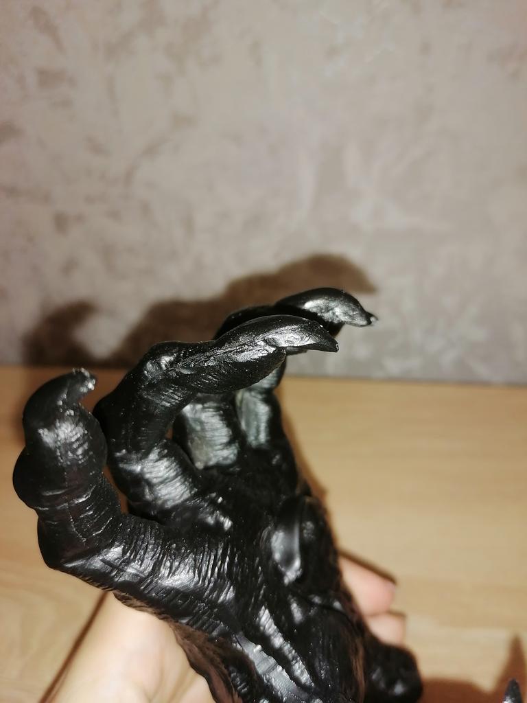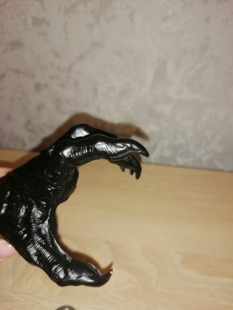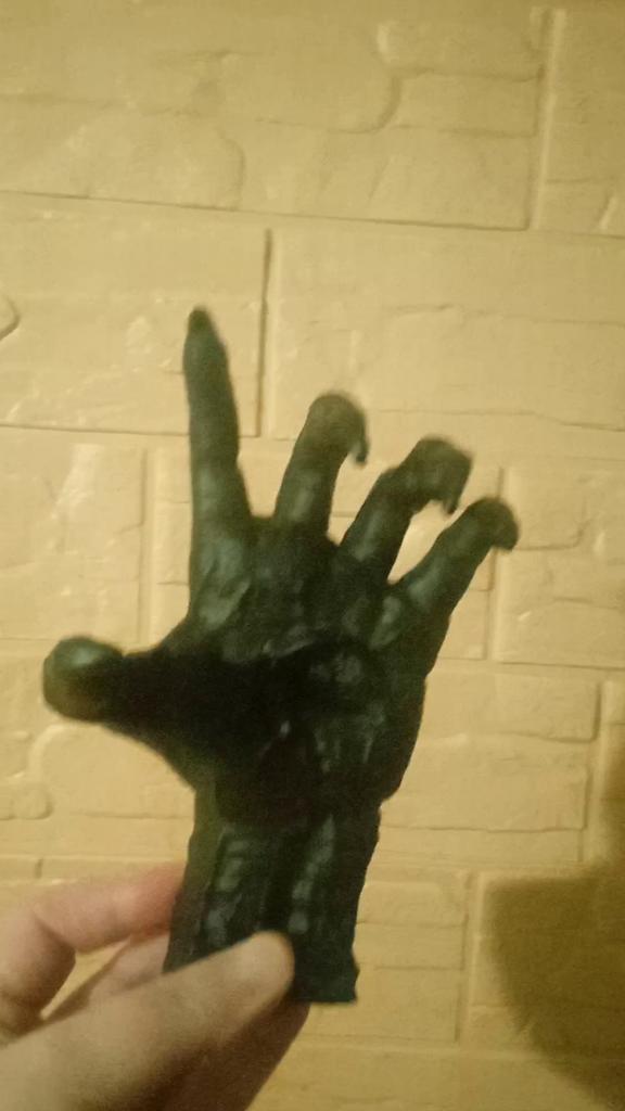 Parece legal. Quanto ao tamanho - como a mão de uma criança de 10 anos, só que com garras e uma pálpebra vazia na palma da mão. A fixação não segura de jeito nenhum, até colei. Nos dedos, as marcas do molde não foram removidas, em alguns lugares vê-se que tentaram remover.