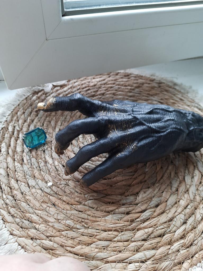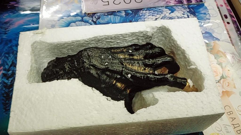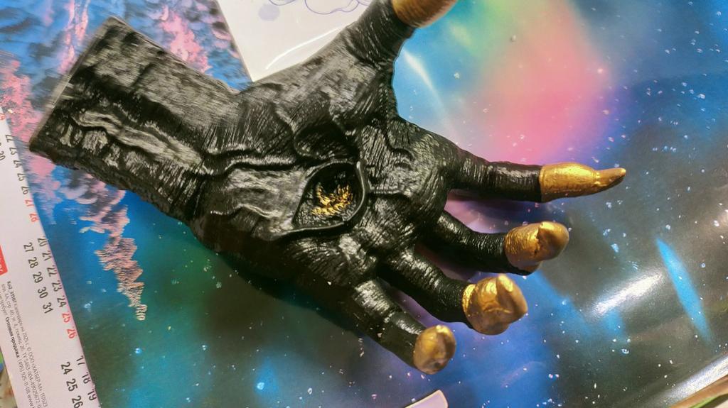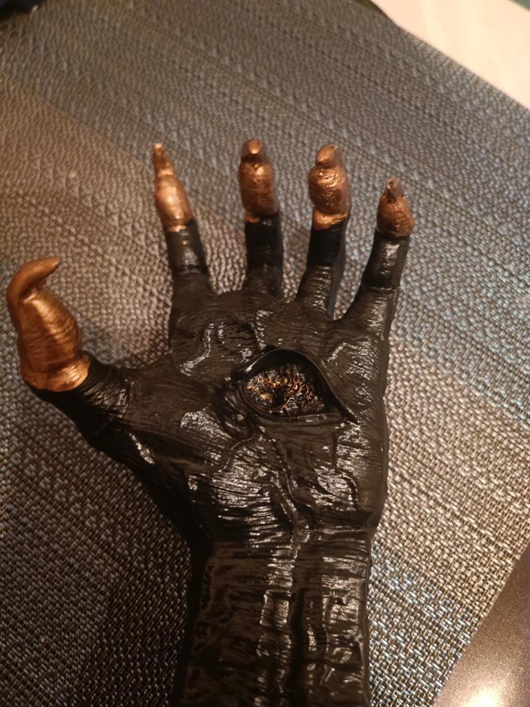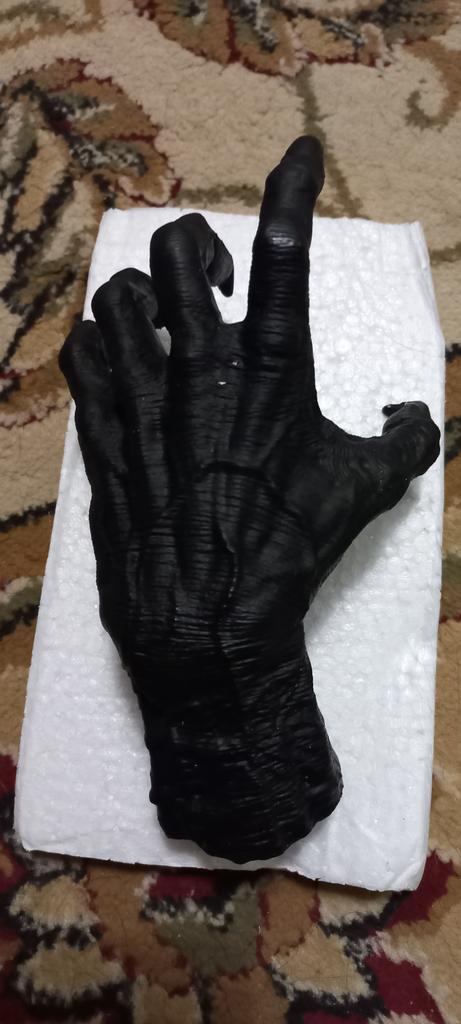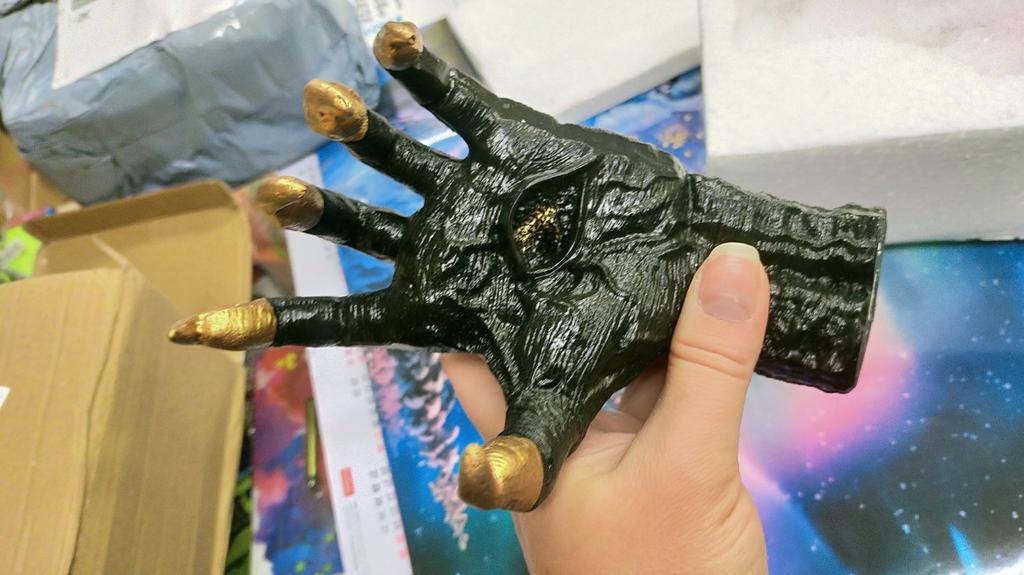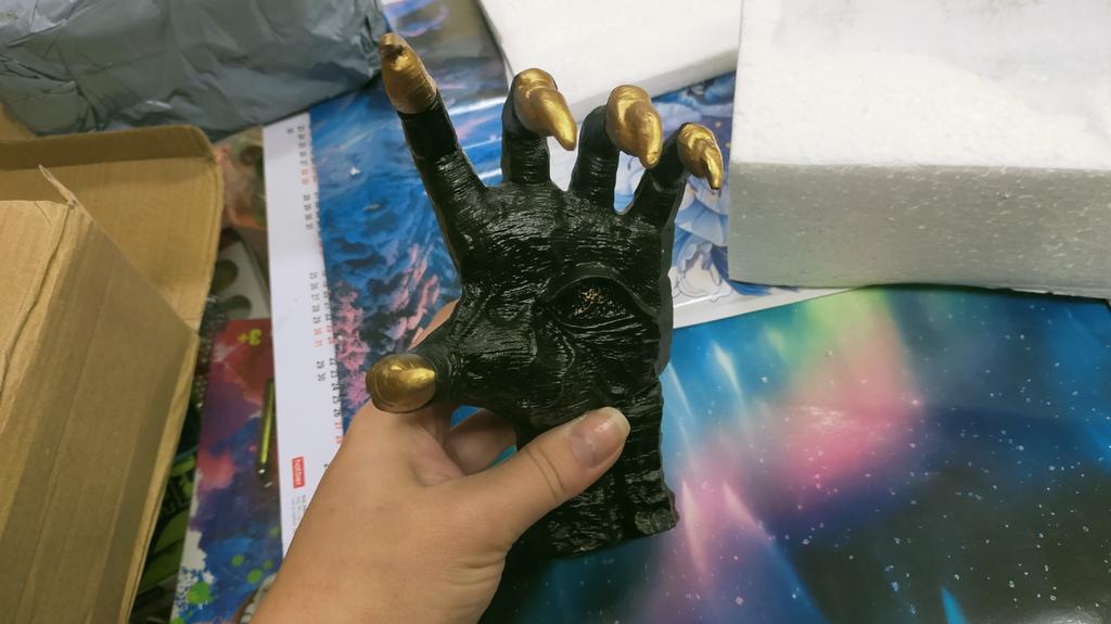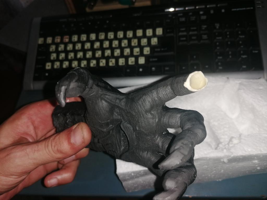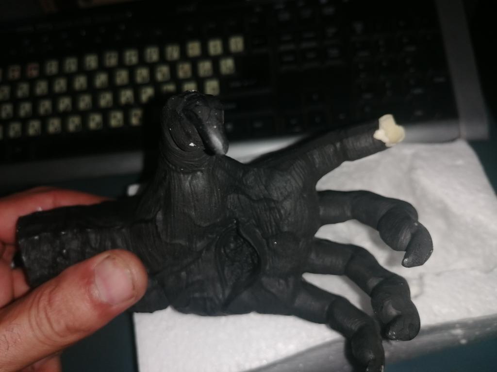 Parece legal. Quanto ao tamanho - como a mão de uma criança de 10 anos, só que com garras e uma pálpebra vazia na palma da mão. A fixação não segura de jeito nenhum, até colei. Nos dedos, as marcas do molde não foram removidas, em alguns lugares vê-se que tentaram remover.