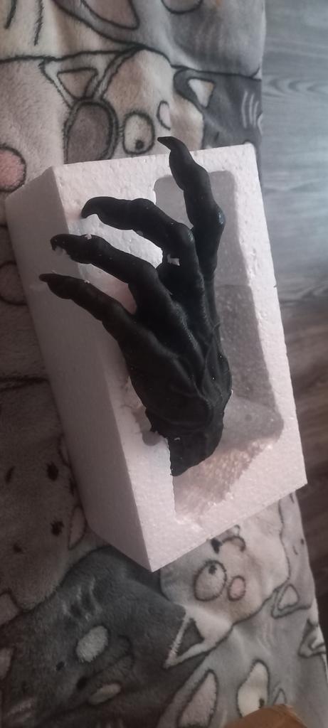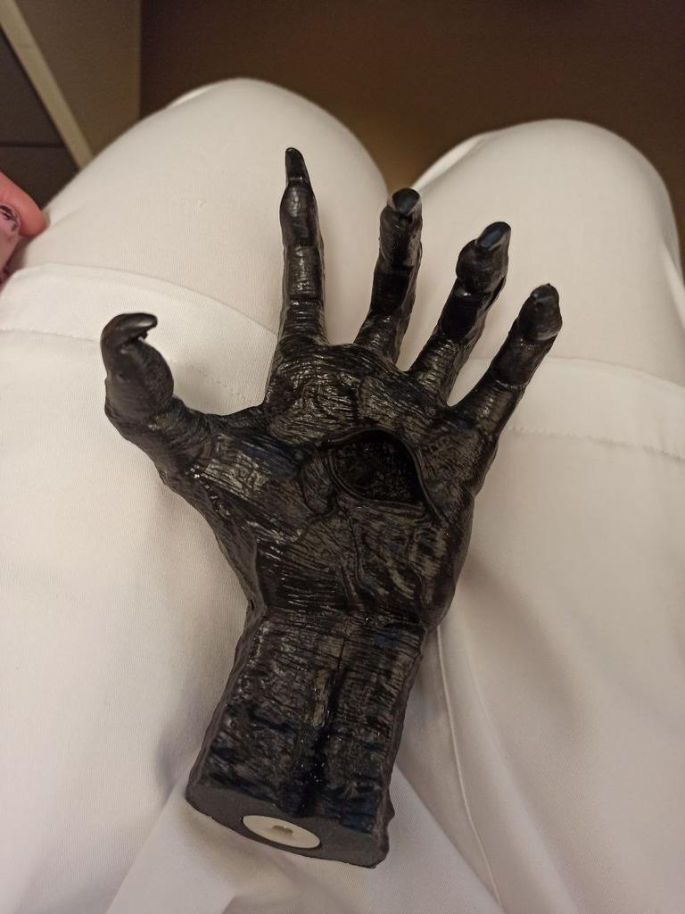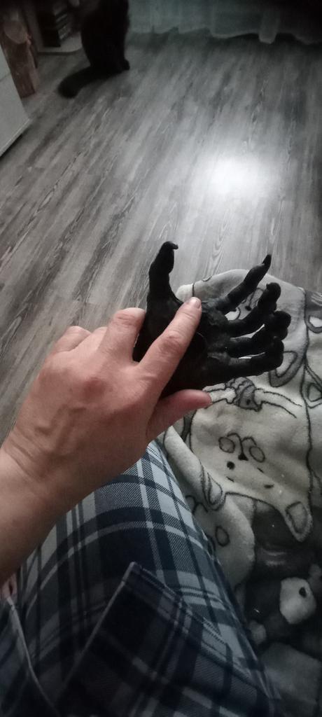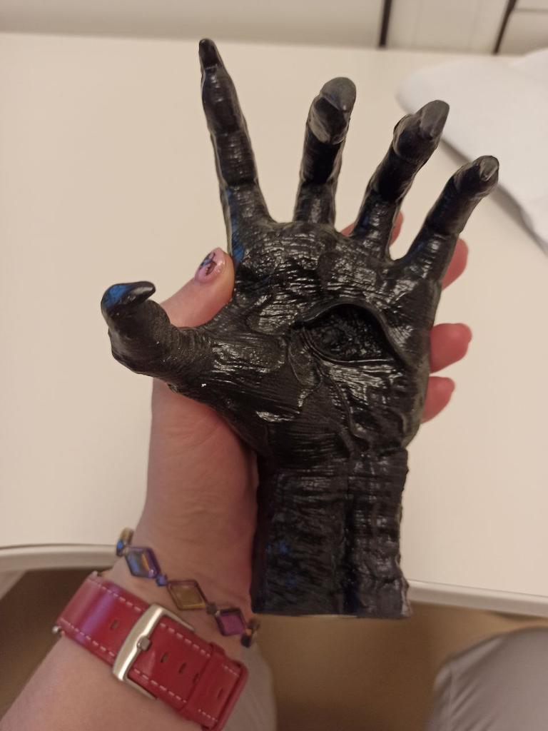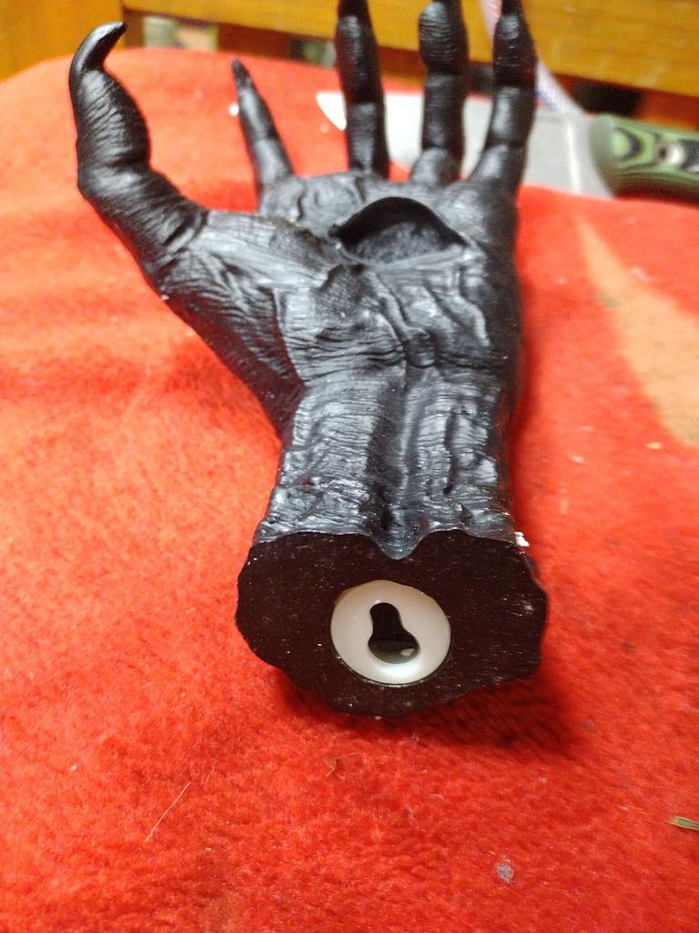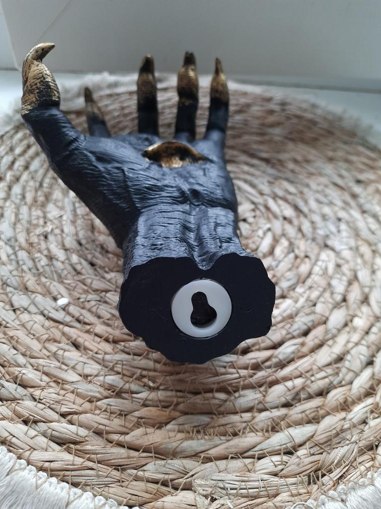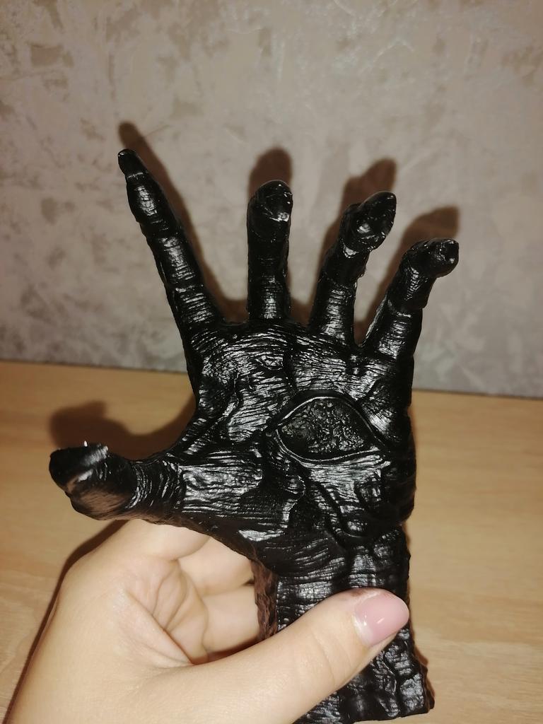 Parece legal. Quanto ao tamanho - como a mão de uma criança de 10 anos, só que com garras e uma pálpebra vazia na palma da mão. A fixação não segura de jeito nenhum, até colei. Nos dedos, as marcas do molde não foram removidas, em alguns lugares vê-se que tentaram remover.