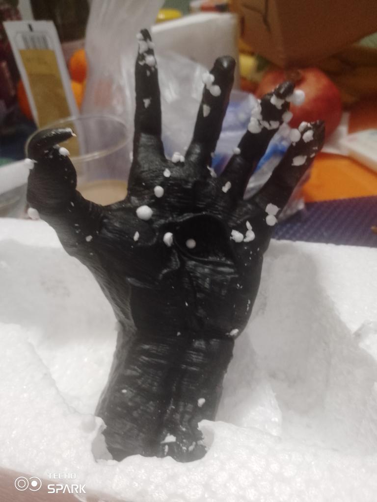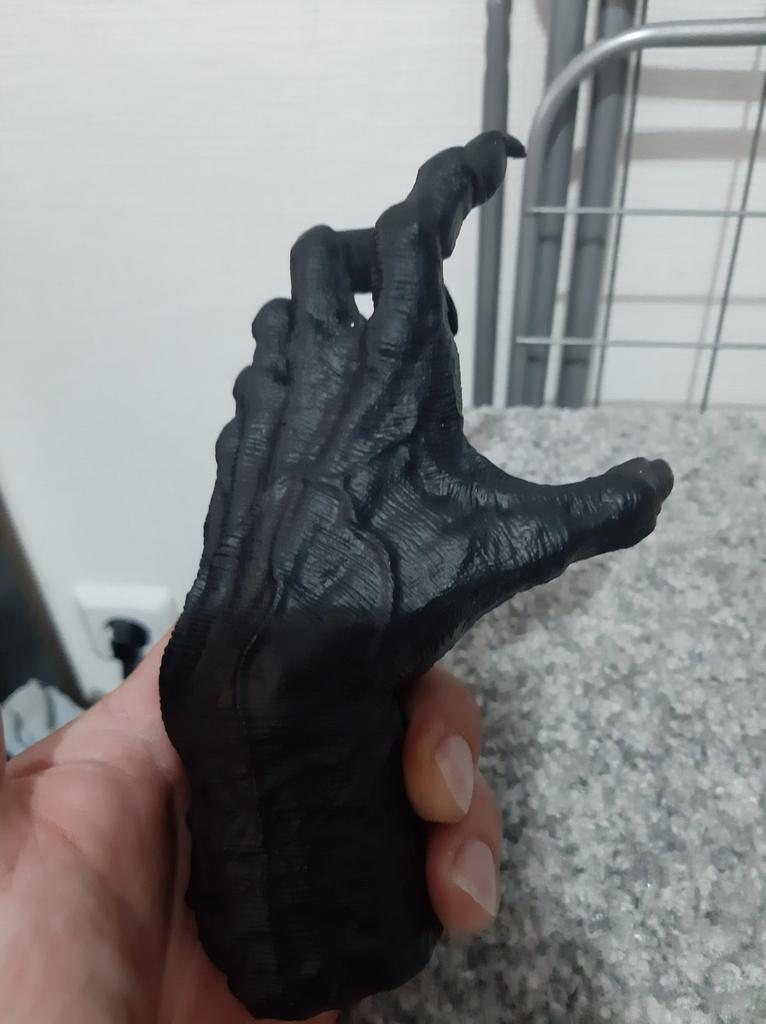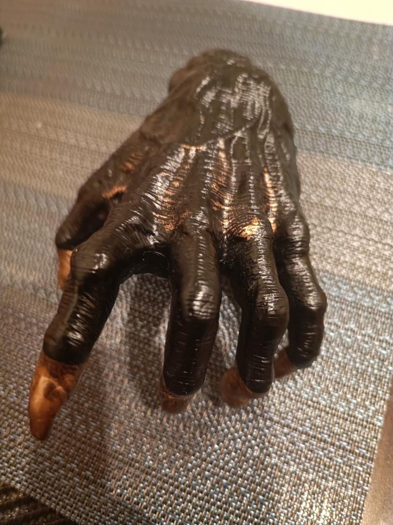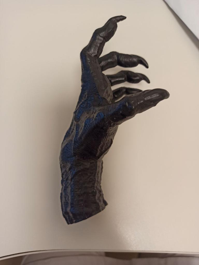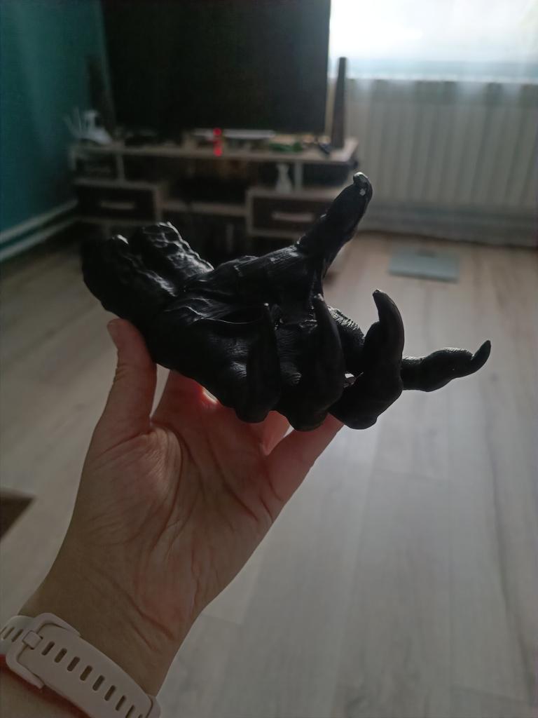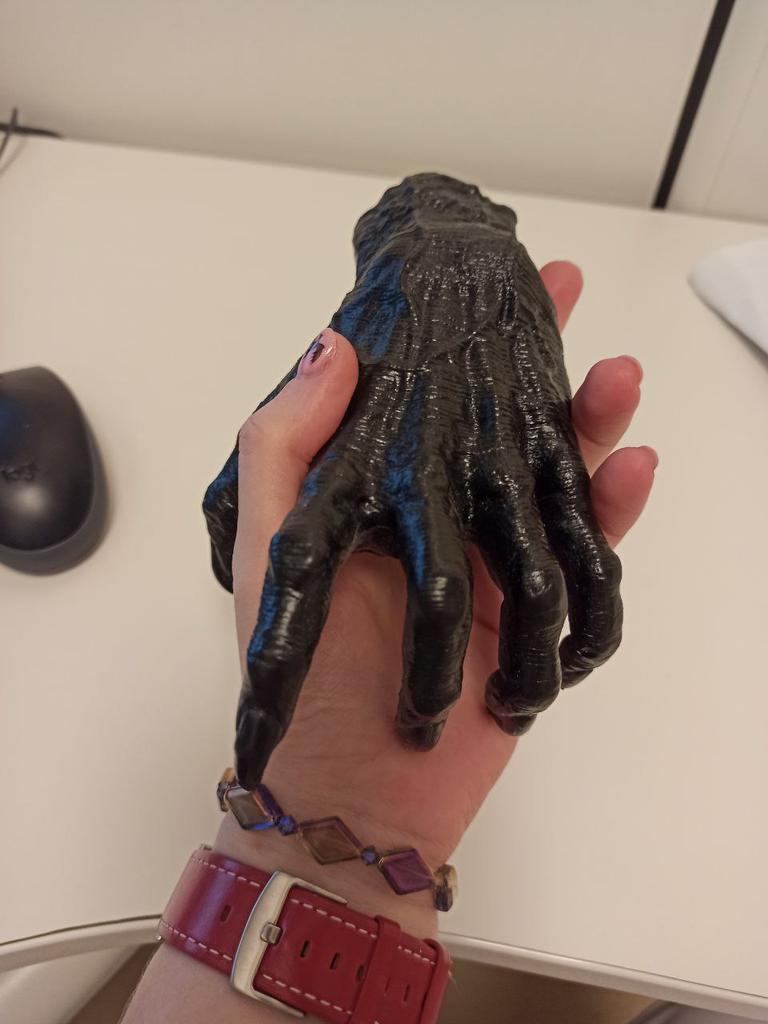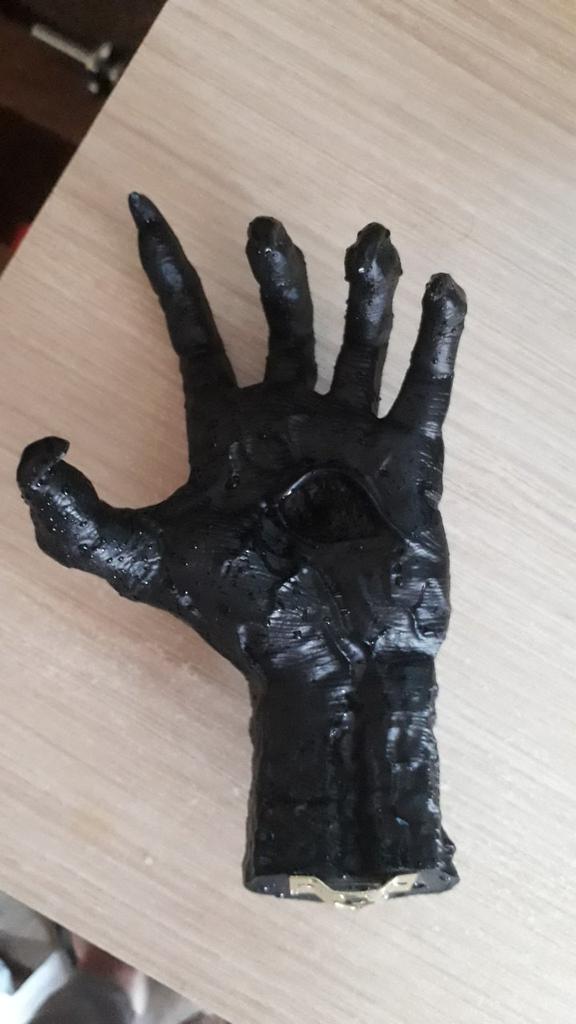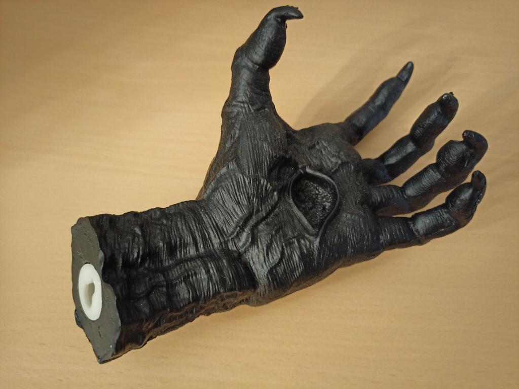 Parece legal. Quanto ao tamanho - como a mão de uma criança de 10 anos, só que com garras e uma pálpebra vazia na palma da mão. A fixação não segura de jeito nenhum, até colei. Nos dedos, as marcas do molde não foram removidas, em alguns lugares vê-se que tentaram remover.