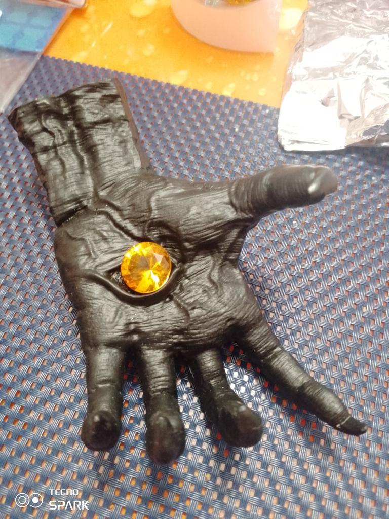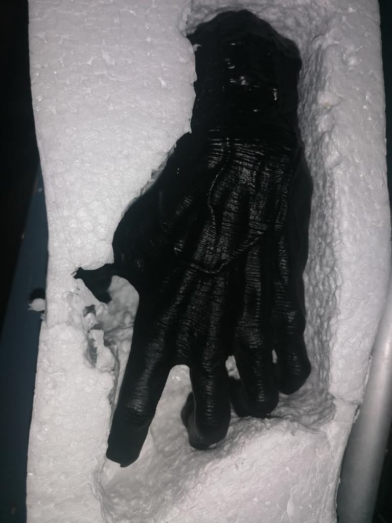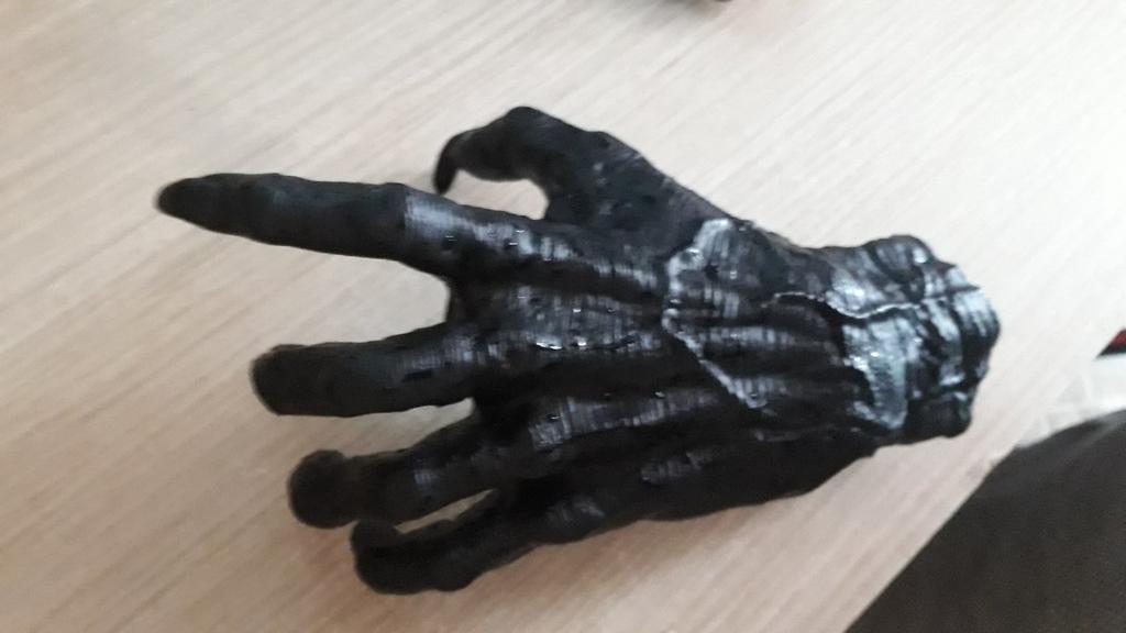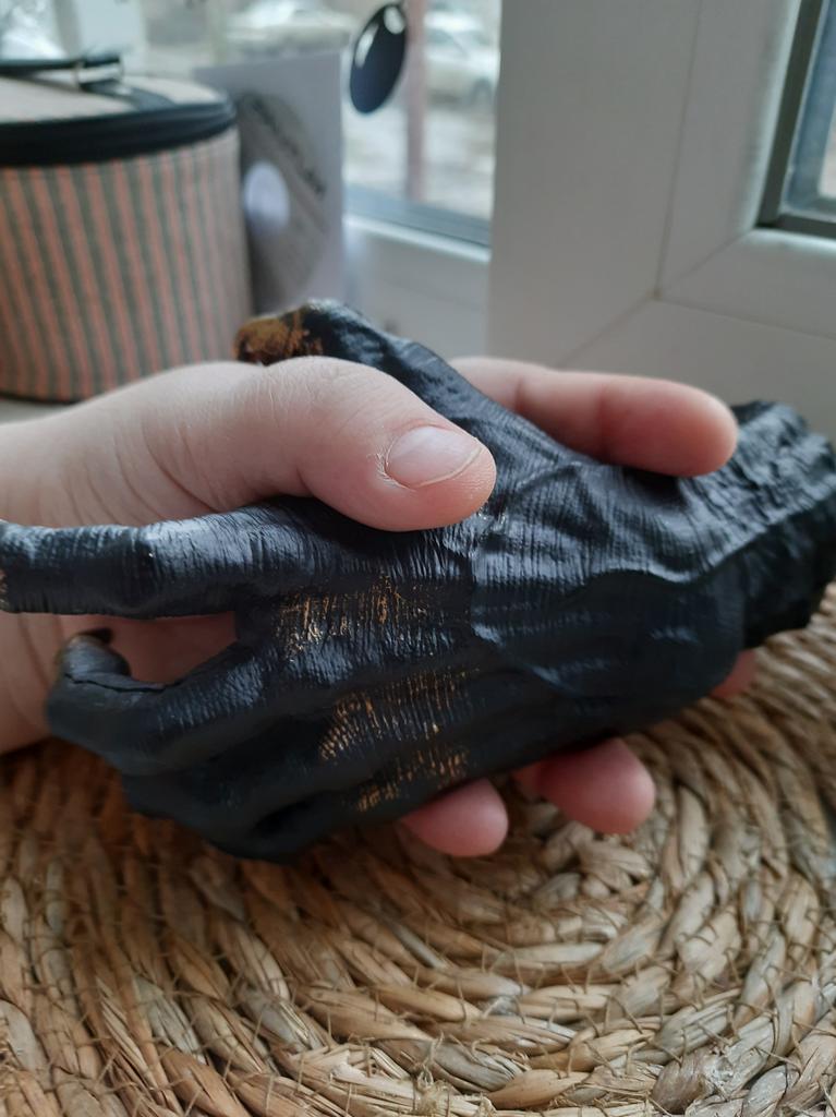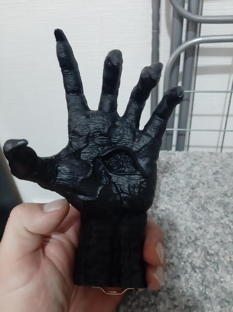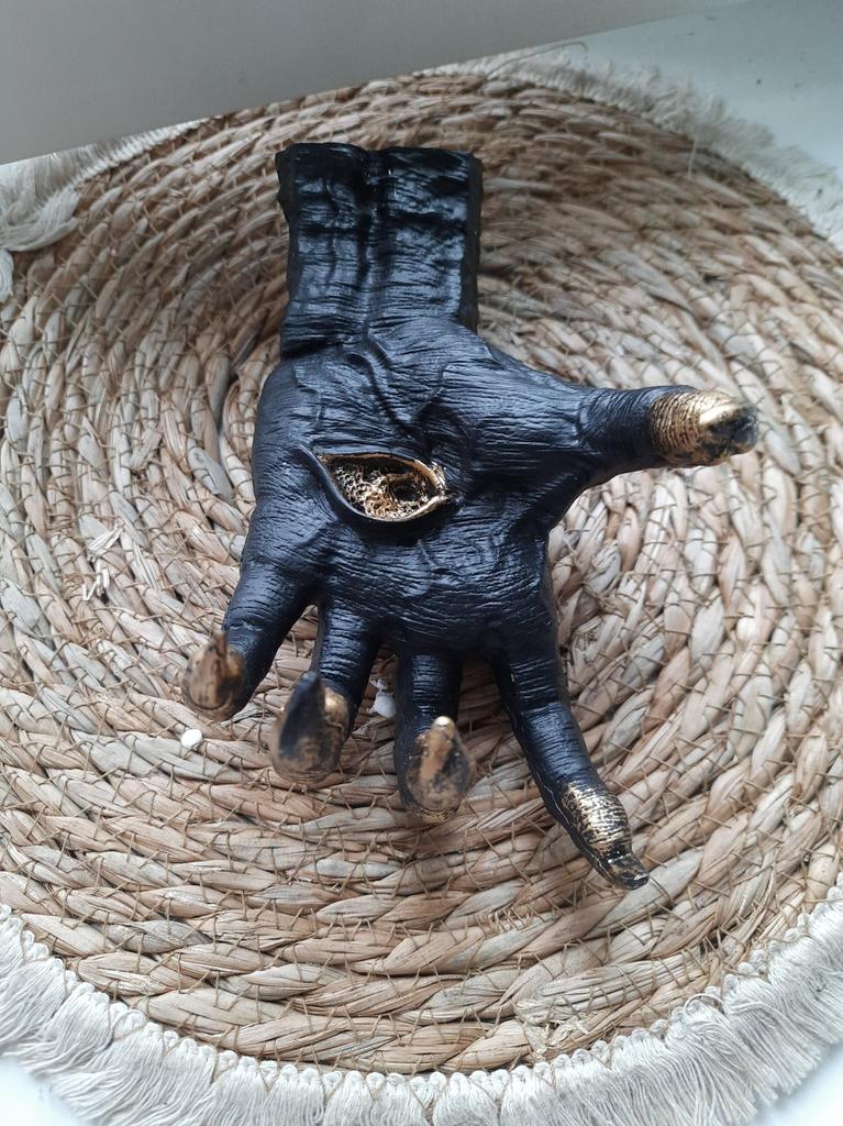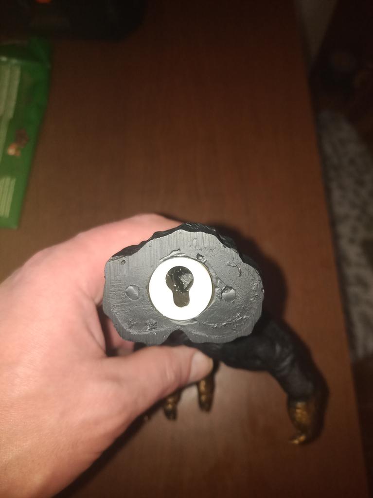 Parece legal. Quanto ao tamanho - como a mão de uma criança de 10 anos, só que com garras e uma pálpebra vazia na palma da mão. A fixação não segura de jeito nenhum, até colei. Nos dedos, as marcas do molde não foram removidas, em alguns lugares vê-se que tentaram remover.