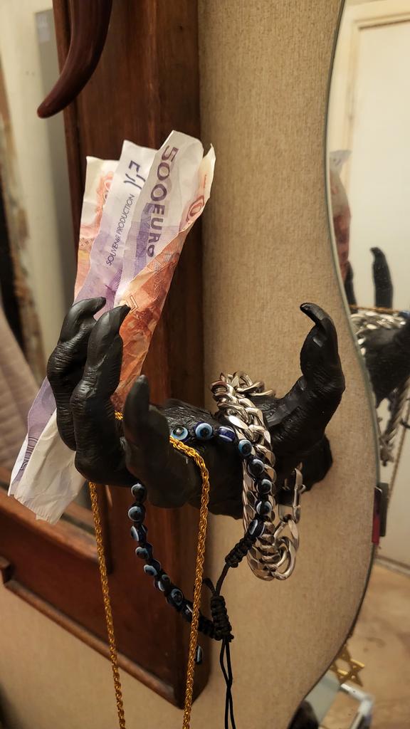 A escultura em si é interessante: as unhas estão mal preenchidas. O kit não inclui nada para prender a mão: ventosa, fita dupla-face ou parafuso auto-roscante.