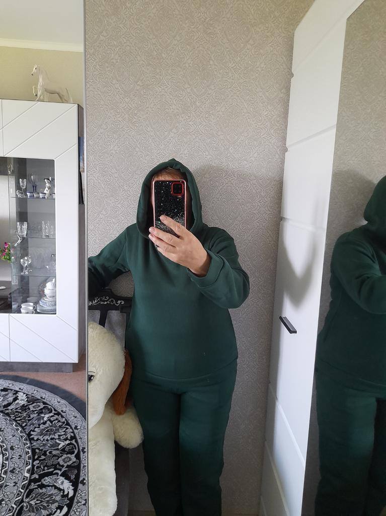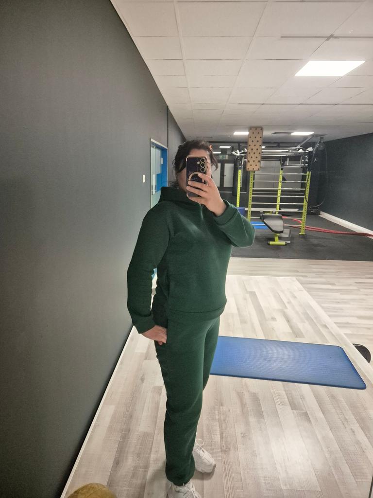 Gosto muito do fato. É quente e a cor é verde escuro. Pedi um tamanho maior.