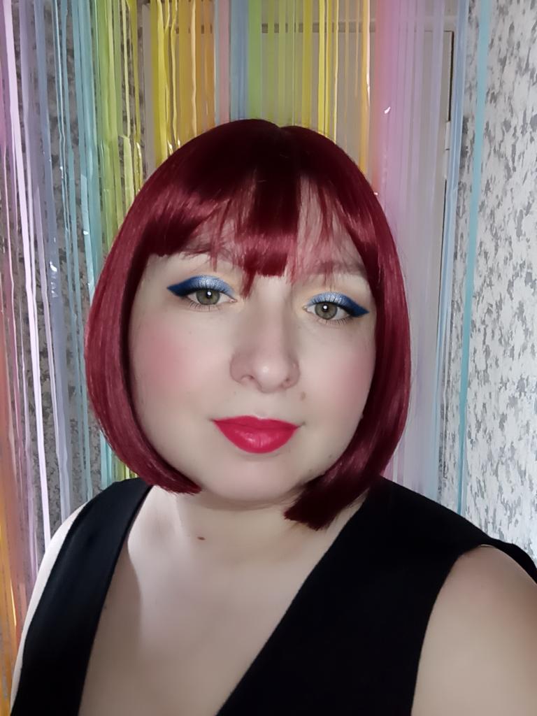 A franja é muito comprida, tive que cortar. E a peruca é boa. Estou feliz.