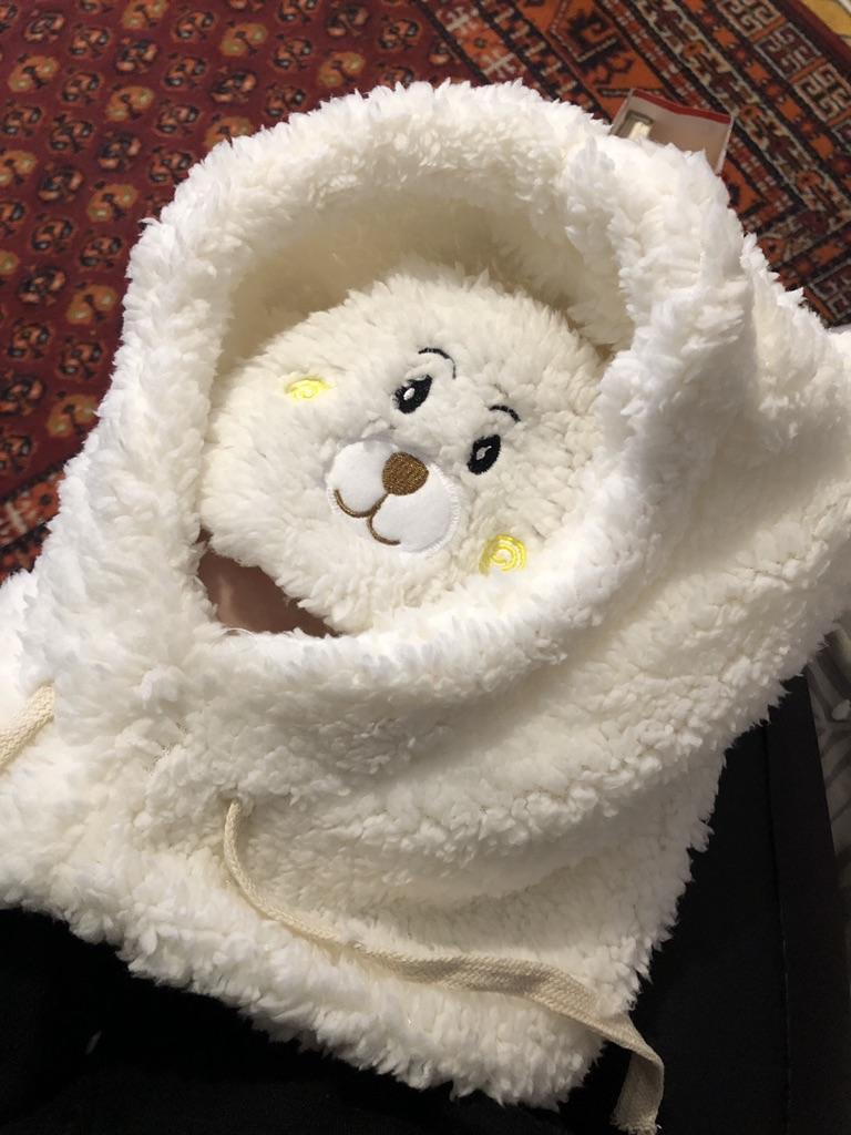 Chapéu legal 🐻❄️🤍 O tamanho não é pequeno, embora seja destinado a crianças, cabe também em um adulto, mas sem fanatismo 😅 A tampa é muito macia ao toque, sem cheiro excessivo. Se estiver muito frio, é fácil usar um capuz por cima) A criança fica encantada, estou satisfeita, então ao mesmo tempo recomendo 🥰👍🏻