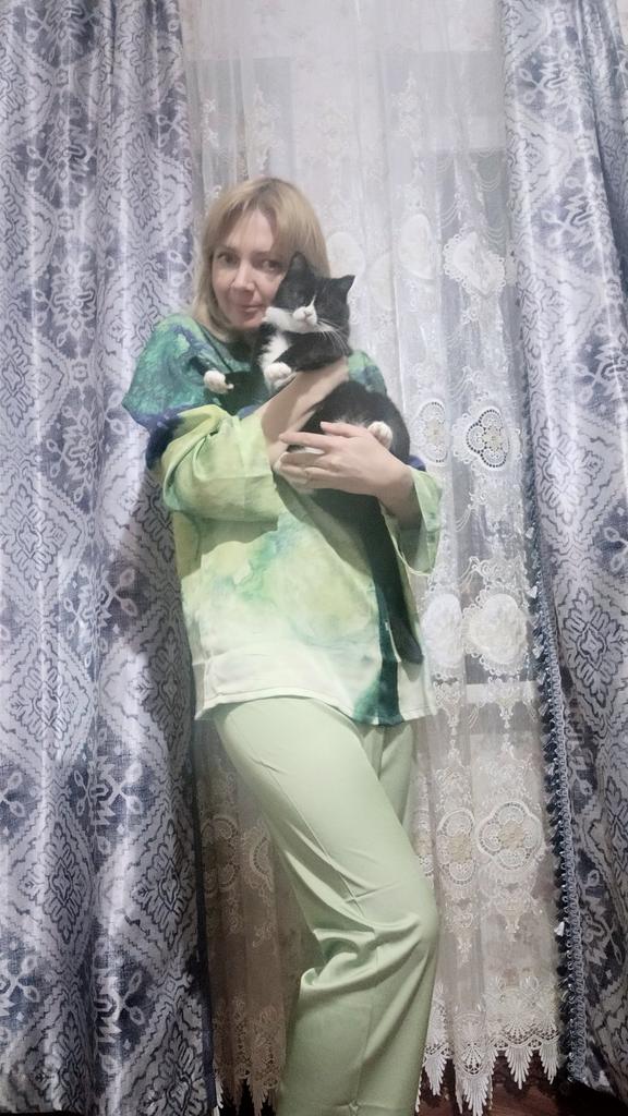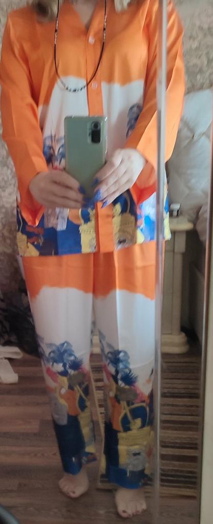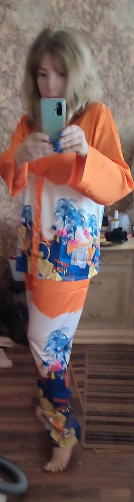 Um lindo terno caseiro para o verão feito de seda artificial, agradável ao corpo, bem costurado, lindo. Eu gostei. O tamanho cabe bem no nosso 48-50, mas fica uma observação: não tem pregas, ou seja, o modelo é pensado para seios pequenos, essa característica do modelo deve ser levada em consideração na hora do pedido. Em geral, o traje é bom, o tecido não é transparente, recomendo antes de comprar
