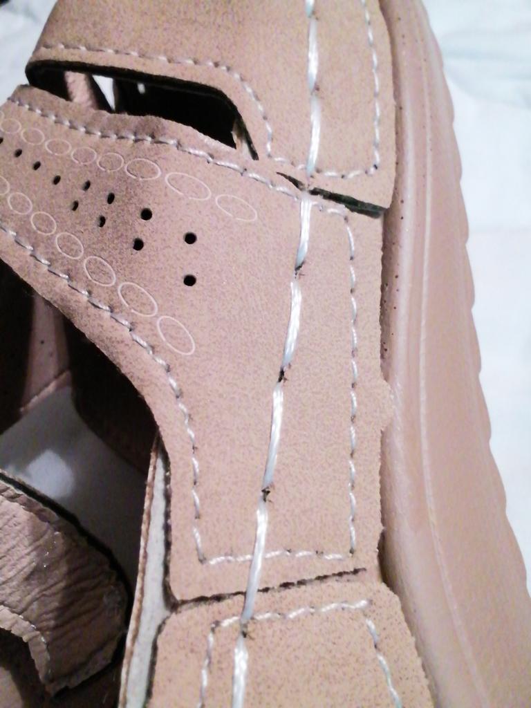 No lado esquerdo da sandália, fios de náilon sobressaem e esfregam o pé, não podem ser retirados.