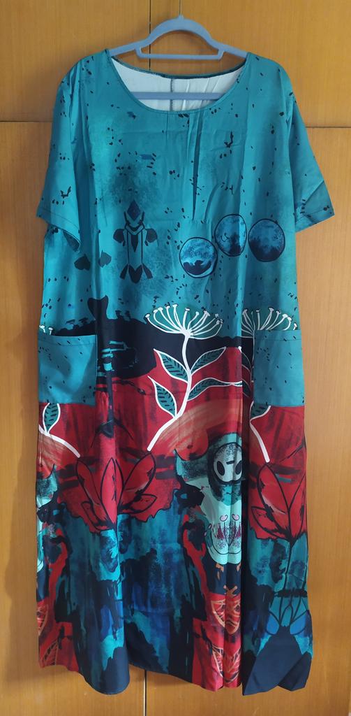 Mulheres primavera verão estilo nacional boêmio vestido longo reto o-pescoço manga curta solta cintura impressão bolso S-5XL