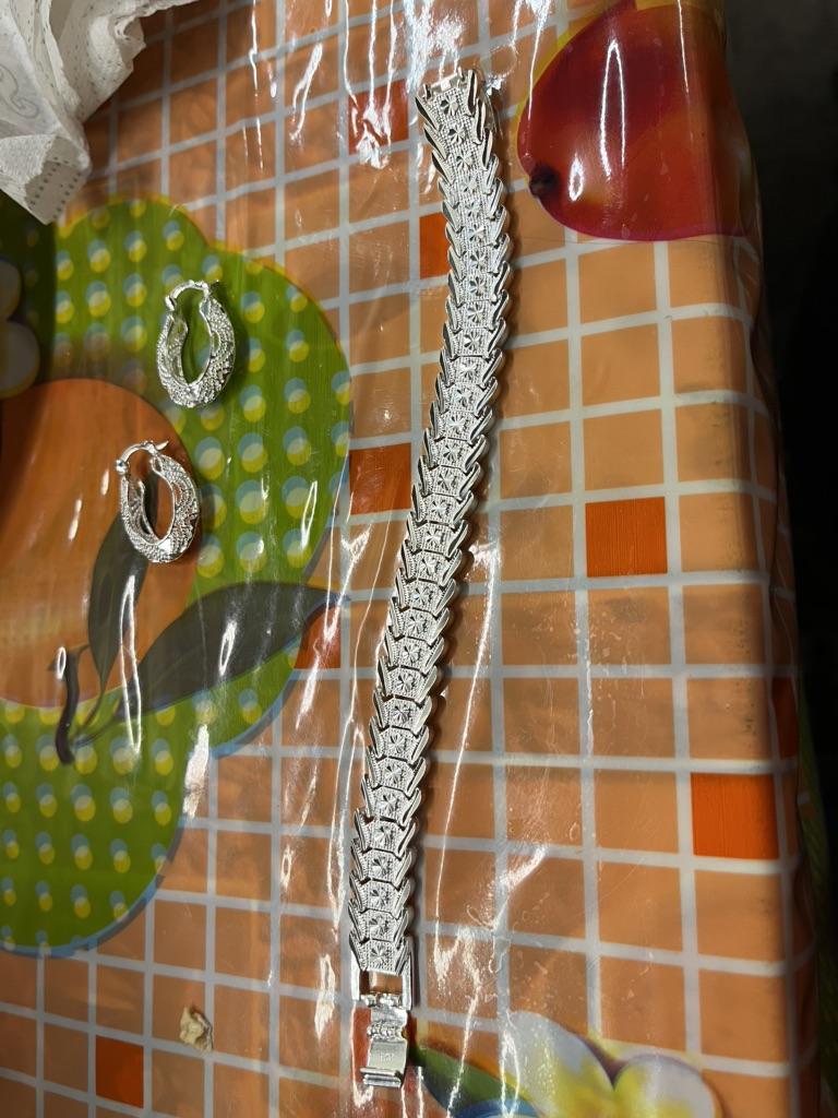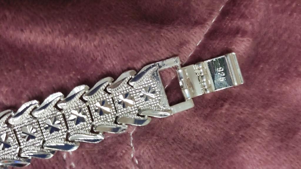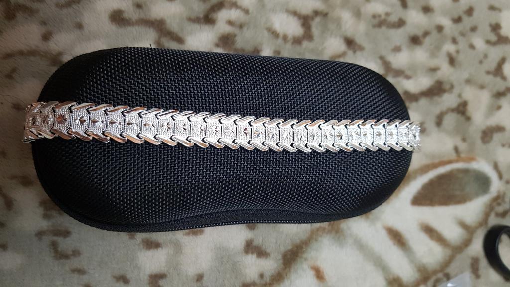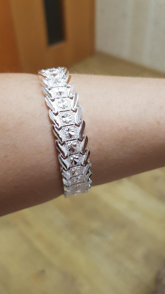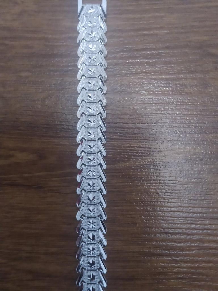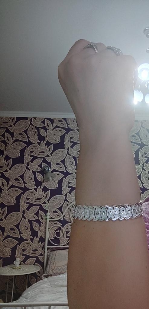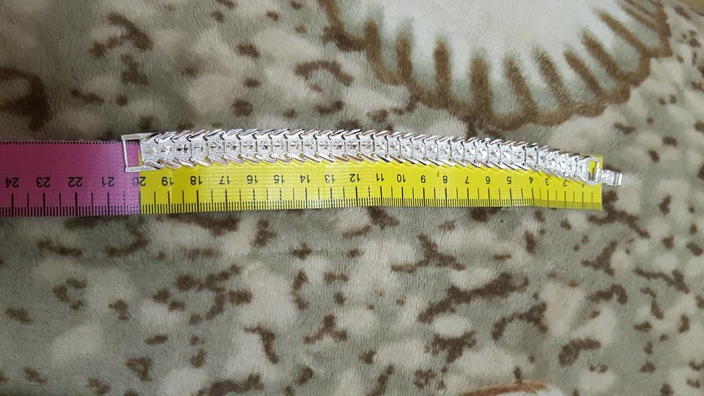 Bonito, largo, leve, cor de prata, pulseira de 20 cm, fácil de encurtar em casa. Recomendo.