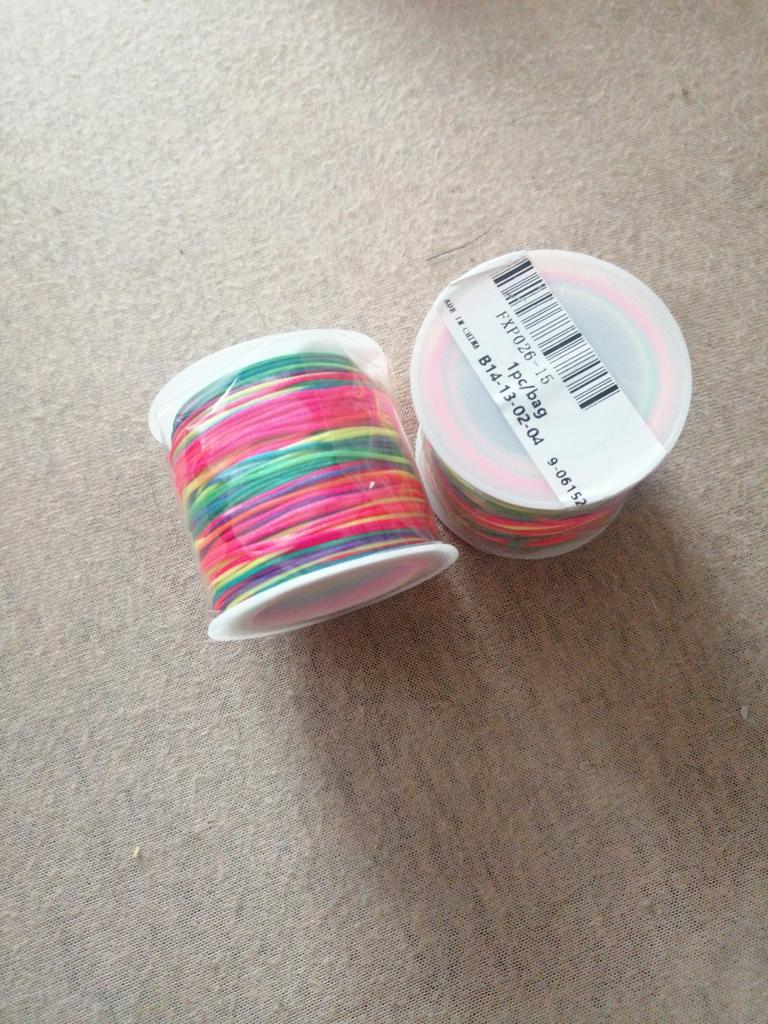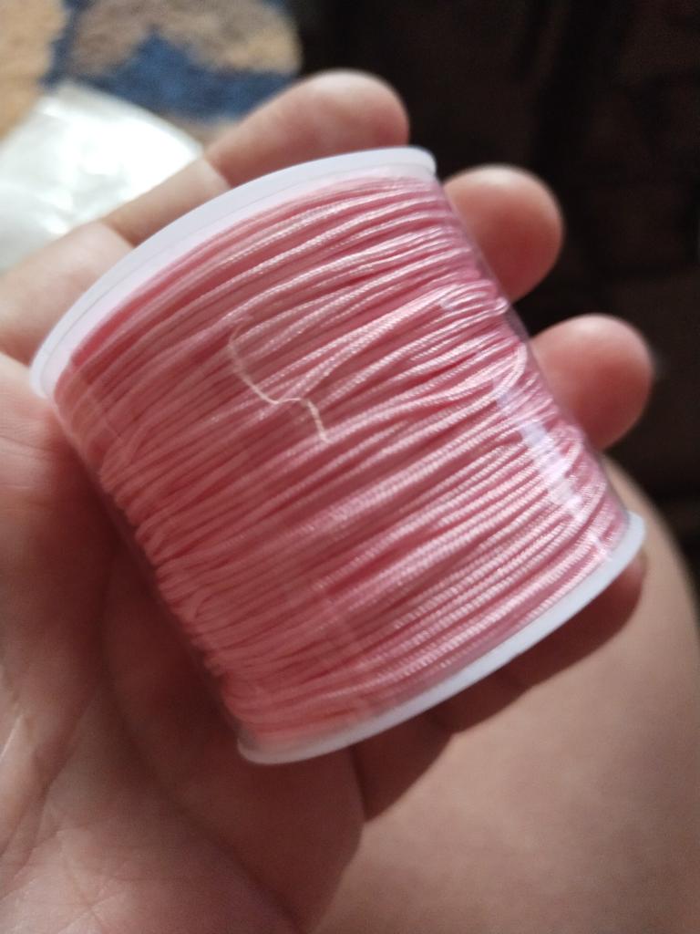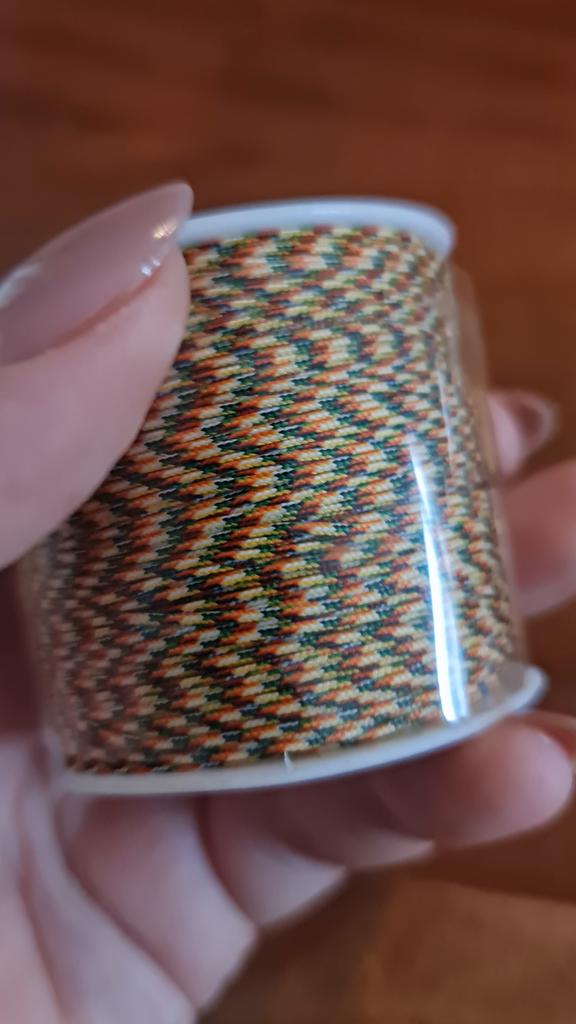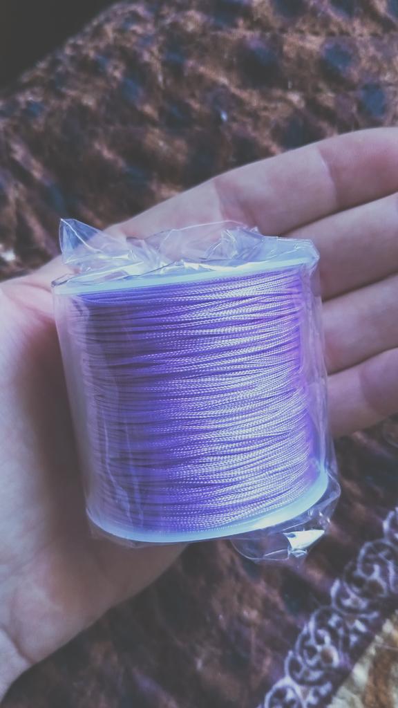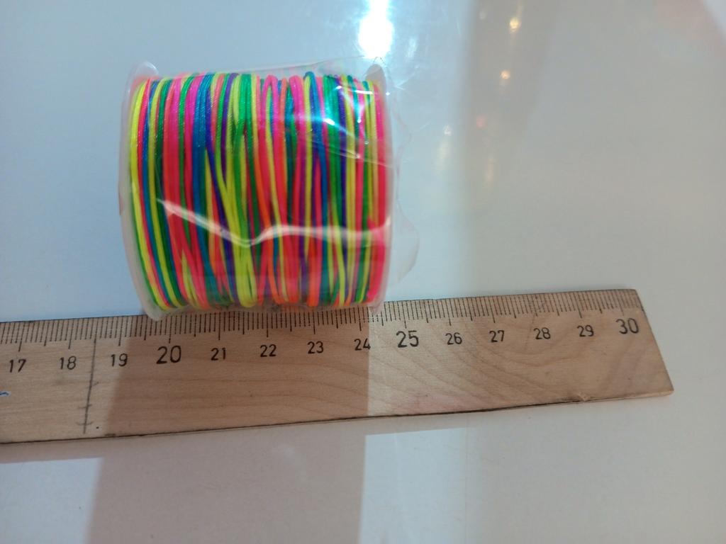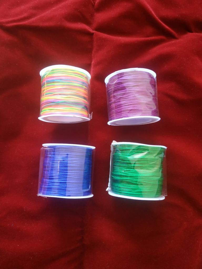 Fio, 0,8 milímetros por 50 metros. Pode ser bem processado. Você pode trançar ou fazer crochê pulseiras muito boas com ele.