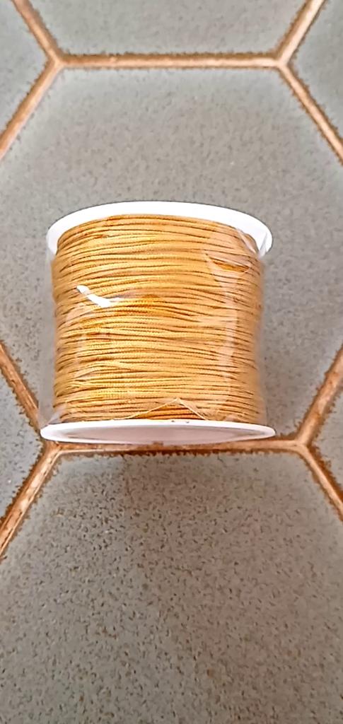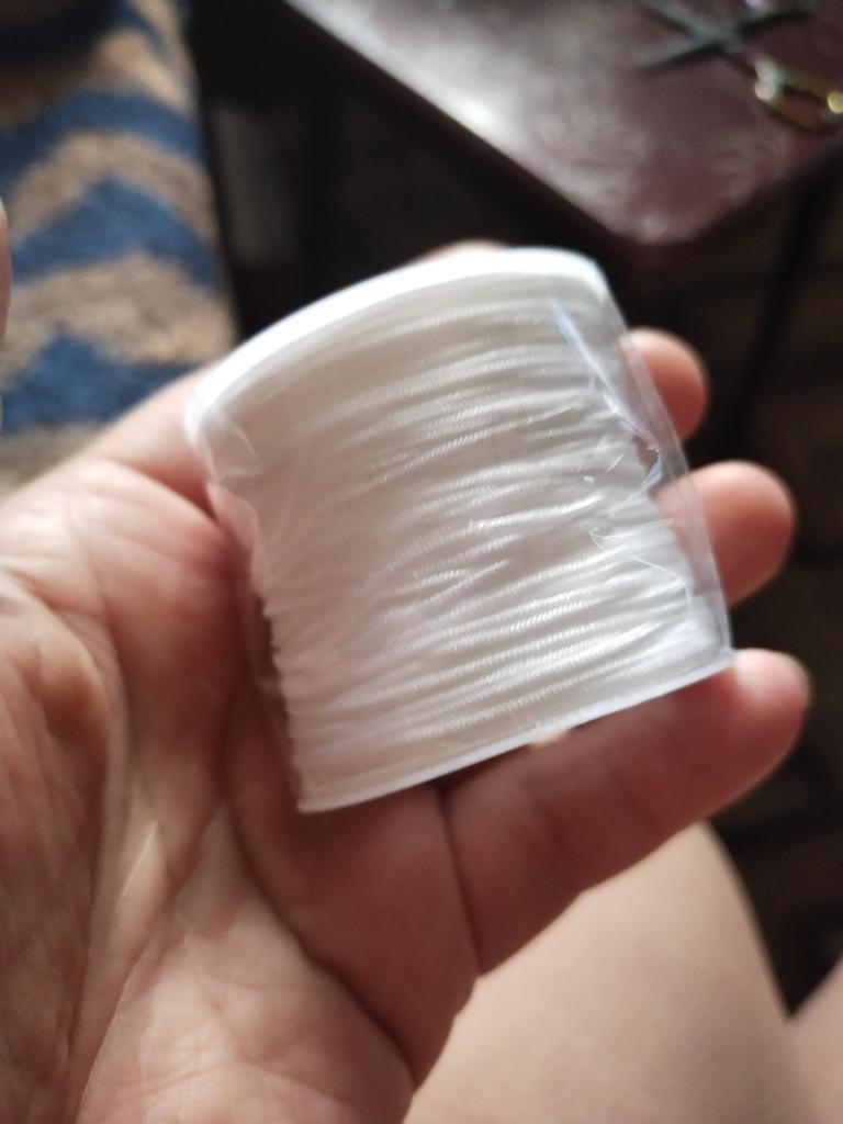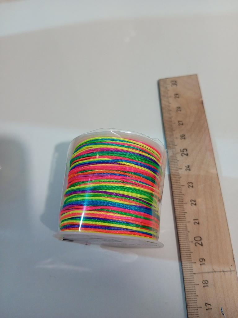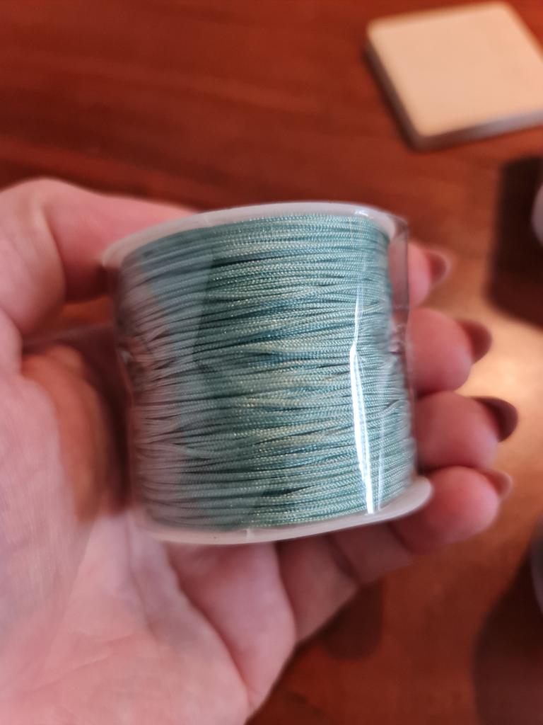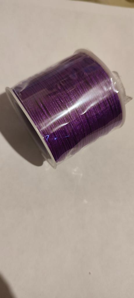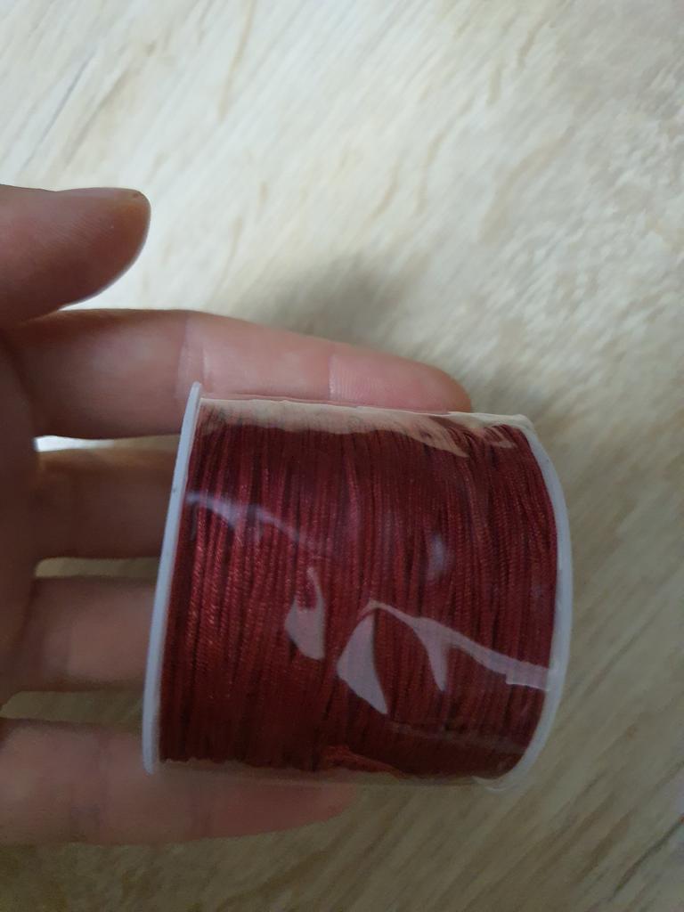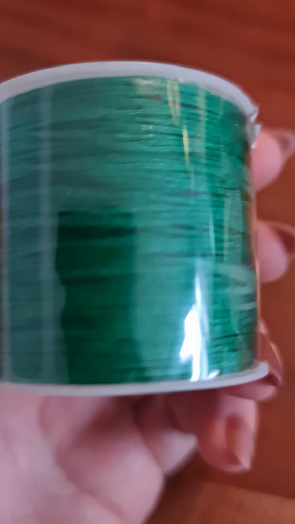Fio, 0,8 milímetros por 50 metros. Pode ser bem processado. Você pode trançar ou fazer crochê pulseiras muito boas com ele.