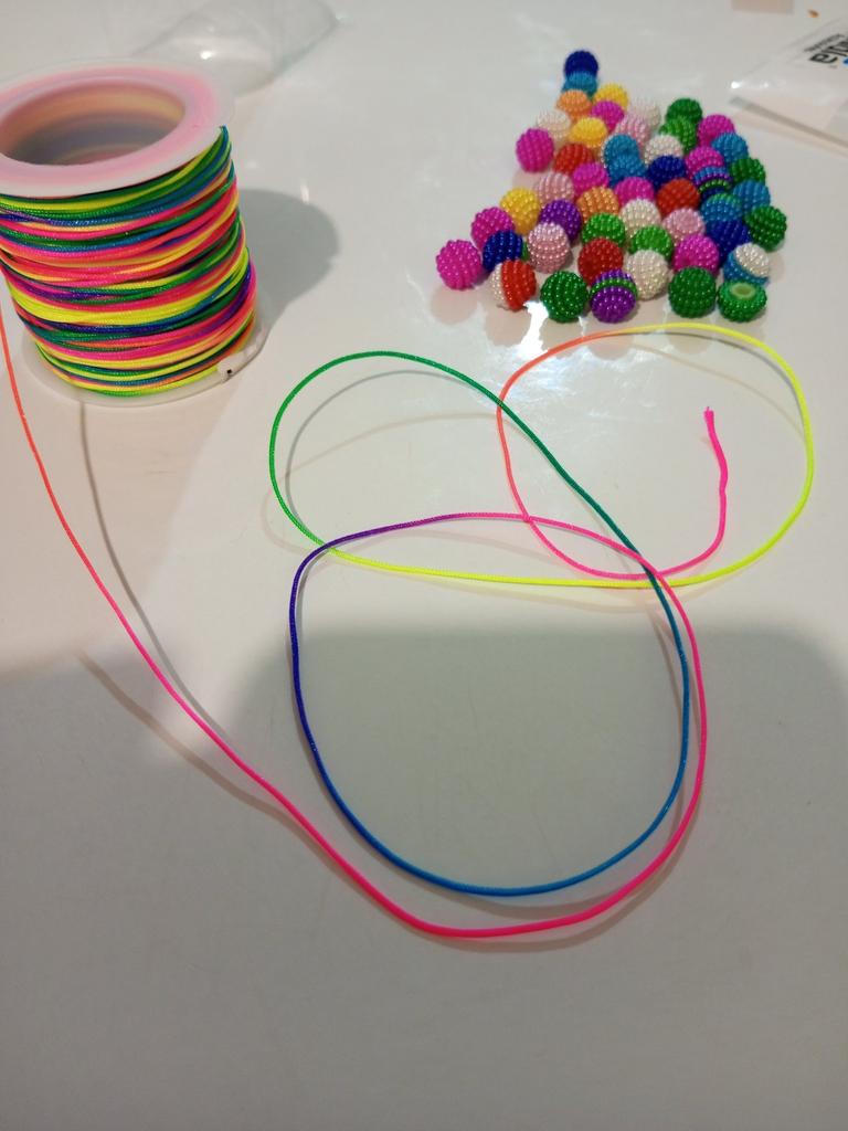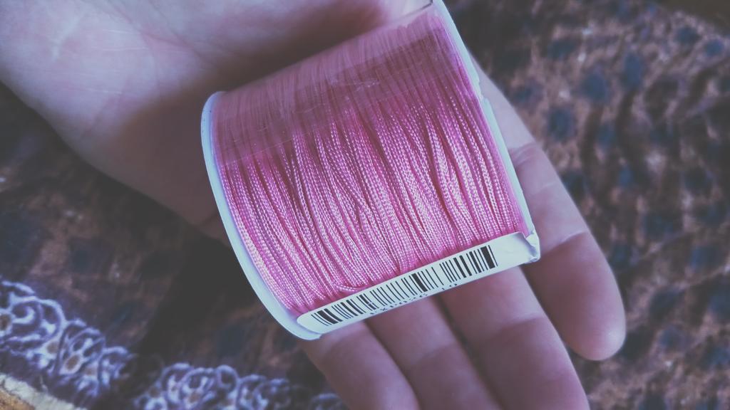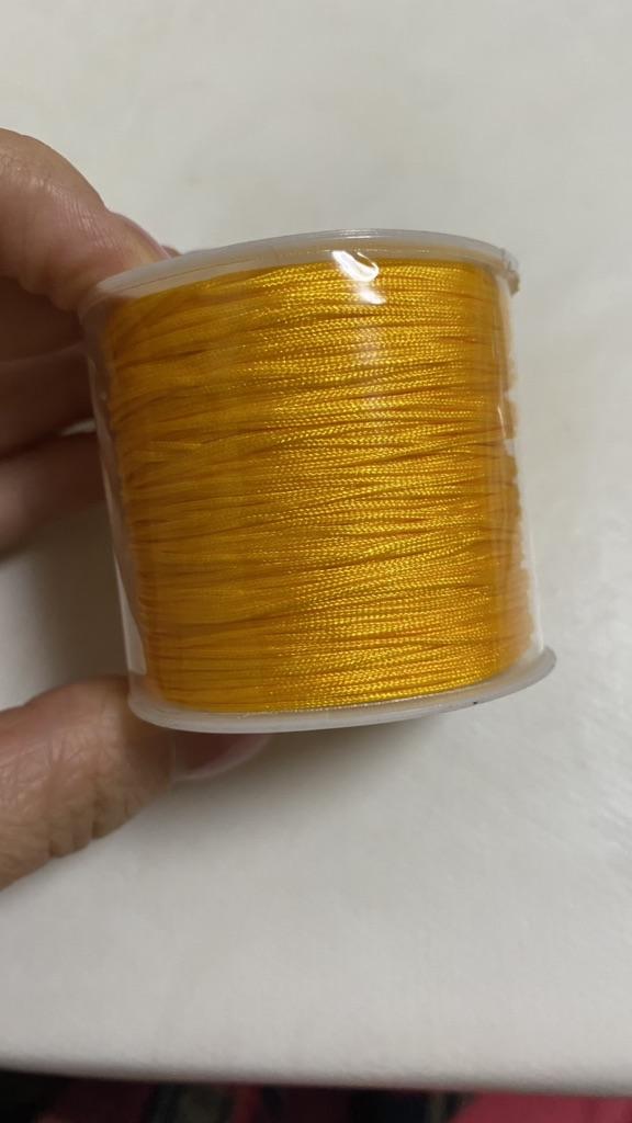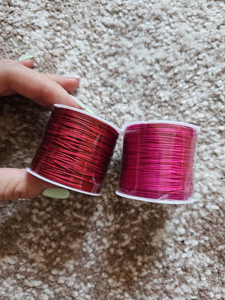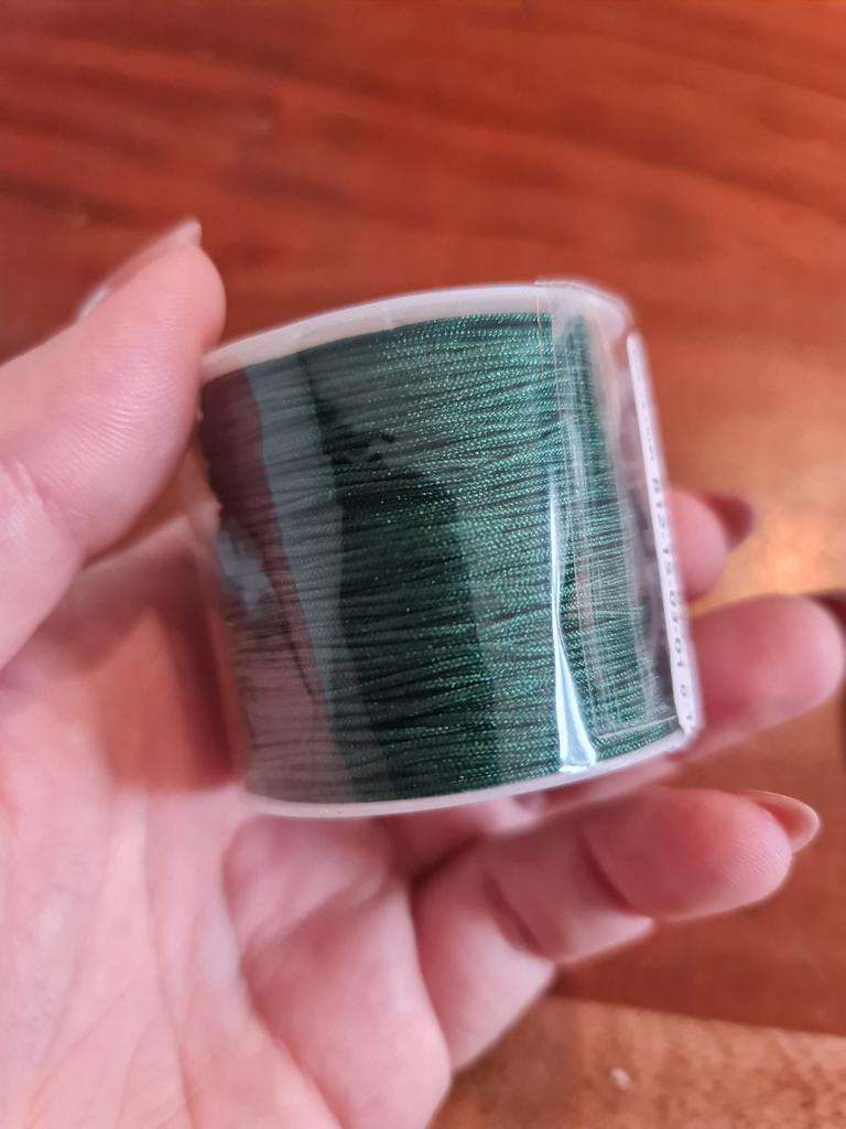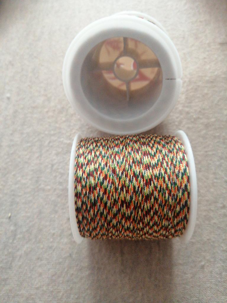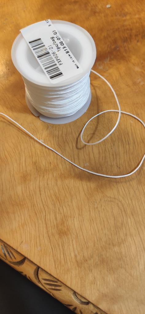 Fio, 0,8 milímetros por 50 metros. Pode ser bem processado. Você pode trançar ou fazer crochê pulseiras muito boas com ele.