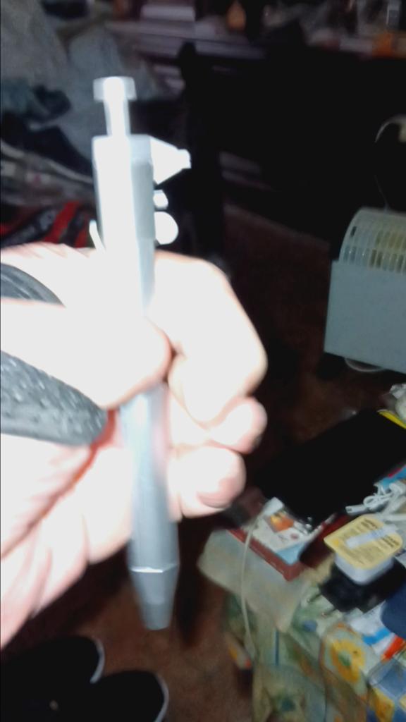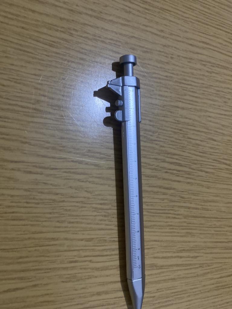 Uma caneta normal com núcleo de plástico preto. A parte superior do botão da haste é achatada. É possível medir algo