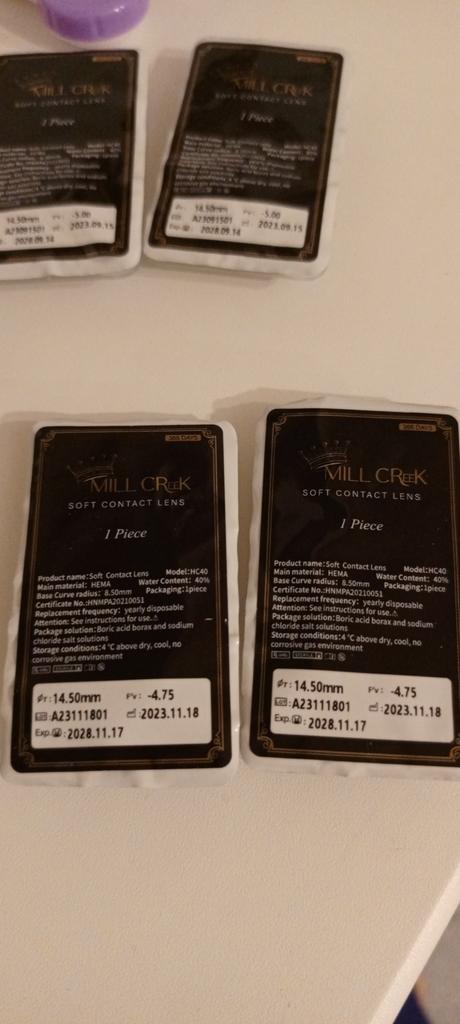 Lindas lentes lilás com dioptrias menos oito, gosto muito da relação qualidade-preço, meus olhos toleram bem essas lentes, você pode usá-las por um mês ou dois, dependendo da sua tolerância pessoal. Estou usando há um mês, já encomendei um monte de lentes de cores diferentes e troco todo mês. Um estojo para guardar lentes está sempre incluído. Compro uma solução especial na farmácia.
