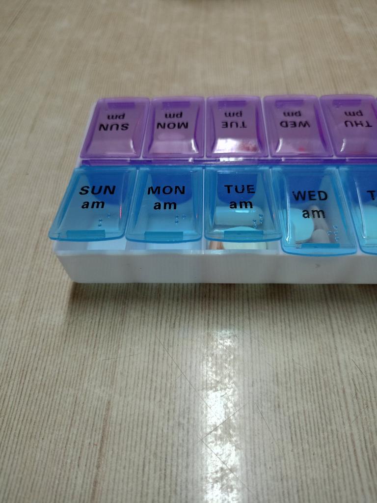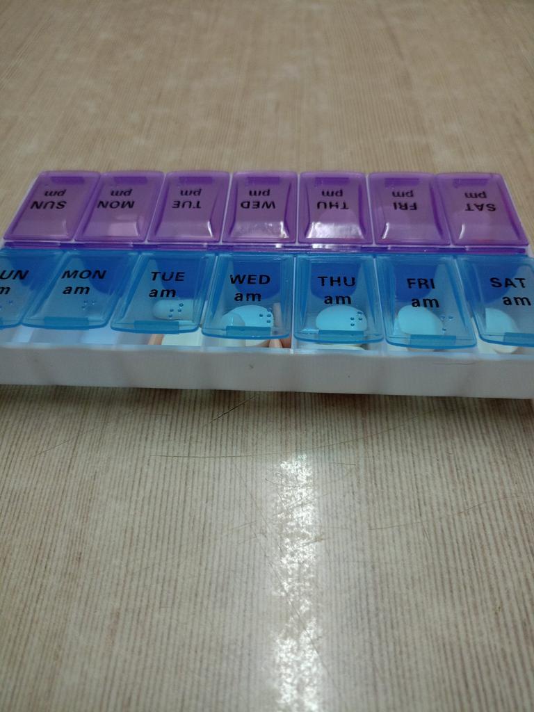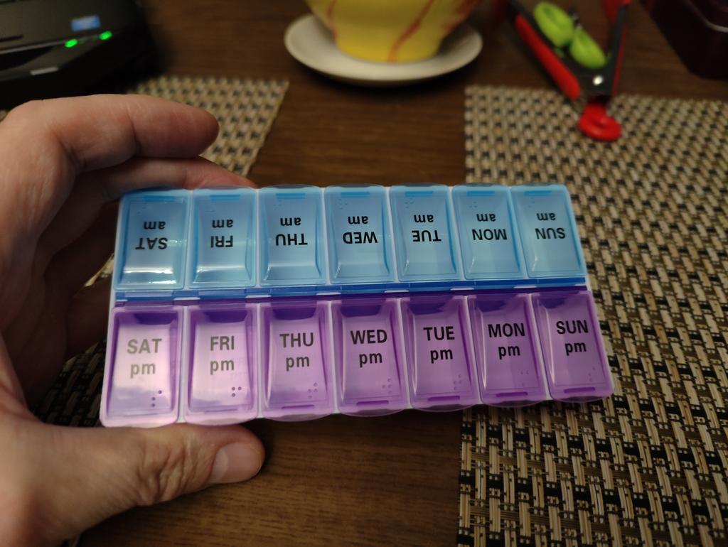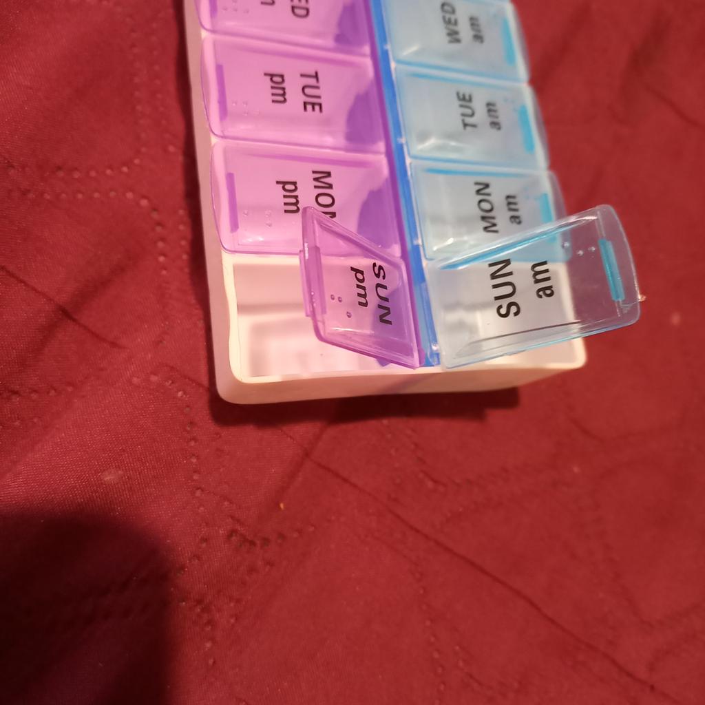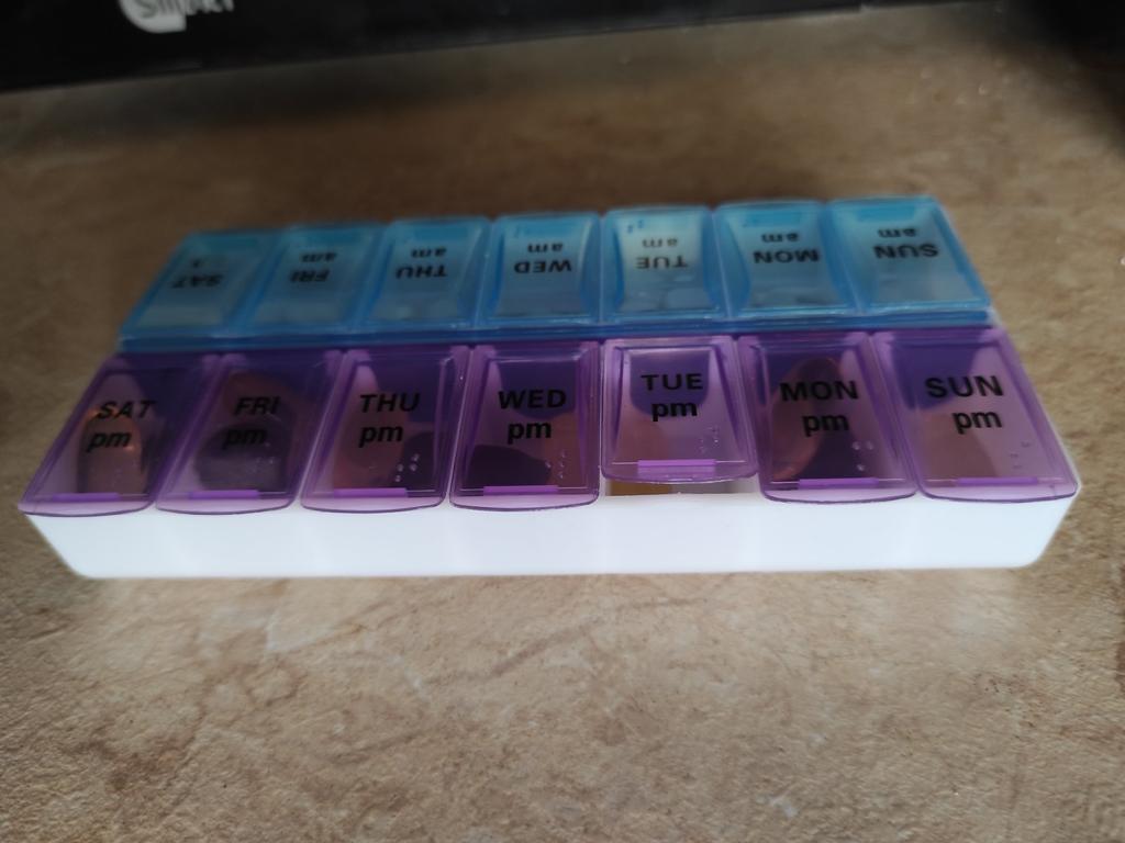 Leve e compacto. Os compartimentos para medicamentos são profundos. As tampas fecham bem, mas não todas (Projetado para uma semana inteira, dia (azul) e noite (roxo). A semana começa no domingo.