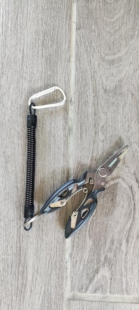 Alicate Tesoura para equipamentos de pesca 🎣. Muito boa qualidade, muito afiada e corta bem, pequena e fácil de trabalhar. Corta bem: monofilamento, multifilamento têxtil e metal. Vem com uma mola telescópica para prender ao cinto, para que não o perca. Atenção, o multifilamento feito de fios metálicos é cortado apenas no recorte no início das lâminas. (imagem 4). Pode-se cortar fios até no máximo 1mm, mas macios, não ferrosos, ou seja, alumínio e cobre, em nenhum caso fio de aço. Já encomendei várias vezes (podem servir também como extrator de anzol e isca sintética da boca de peixes predadores na hora da pescaria). Recomendo, coisa comum para pescaria 🎣💪