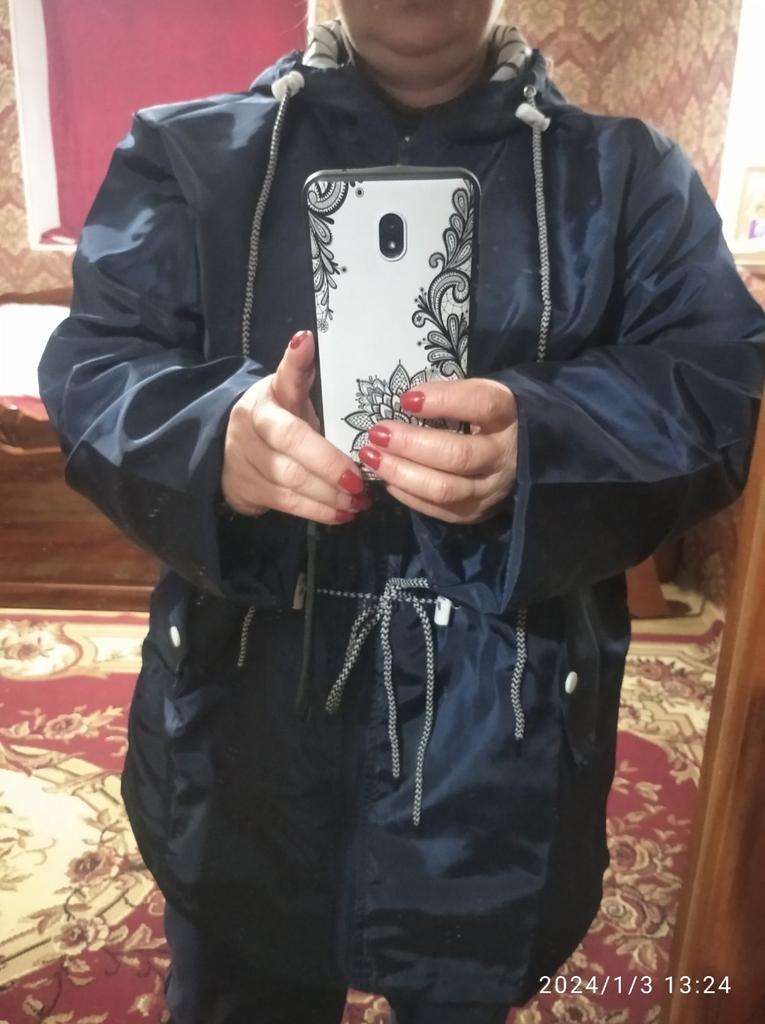 A jaqueta é muito fina, a cor é azul escuro. Este tipo de capa serve para uma mulher de tamanho 52, 5XL. Para mim ficou grande, pois não pedi para mim, ou talvez até para o tamanho 54 (?). mas não maior.