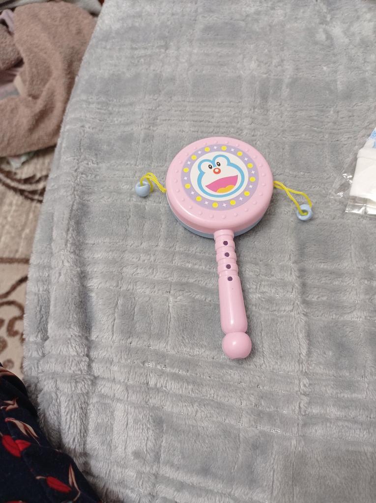 Chocalho pequeno. De dois lados, não prende em nada, ou seja, o bebê não se arranhará. Faz barulho por causa das bolinhas laterais, que também preocupam - o bebê não se machucará com elas?