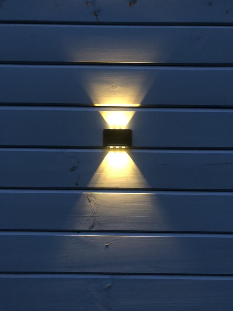 【Solar Powered Auto On and Off 】As luzes de parede exteriores são projetadas exclusivamente para uso exterior. As luzes LED em lados para cima e para baixo acendem-se automaticamente no escuro. Durante 6 horas de carregamento solar solar completo, as luzes podem iluminar-se por 8 horas. (O carregamento e o tempo de trabalho vão mudar dependendo do tempo)