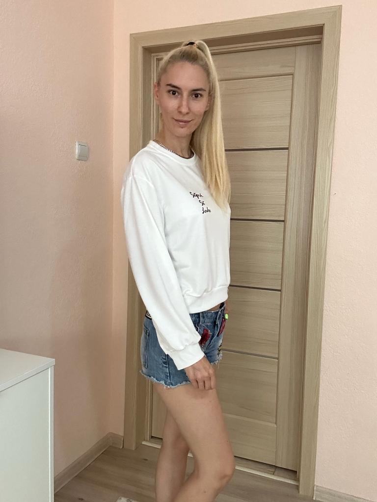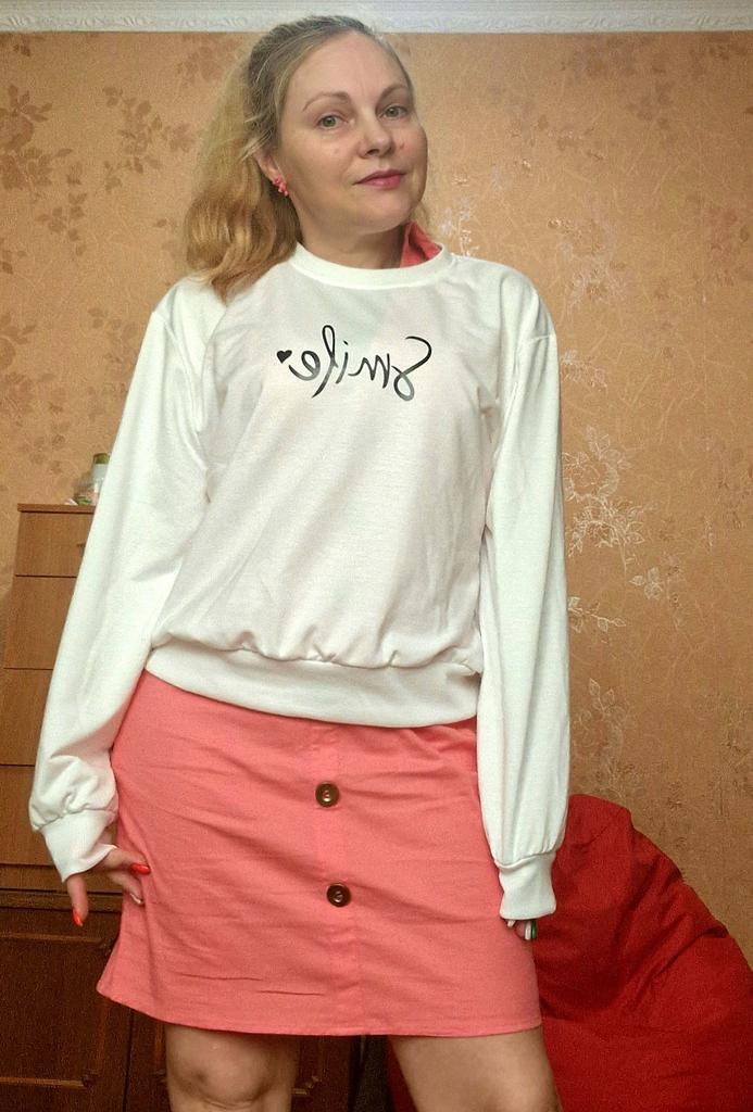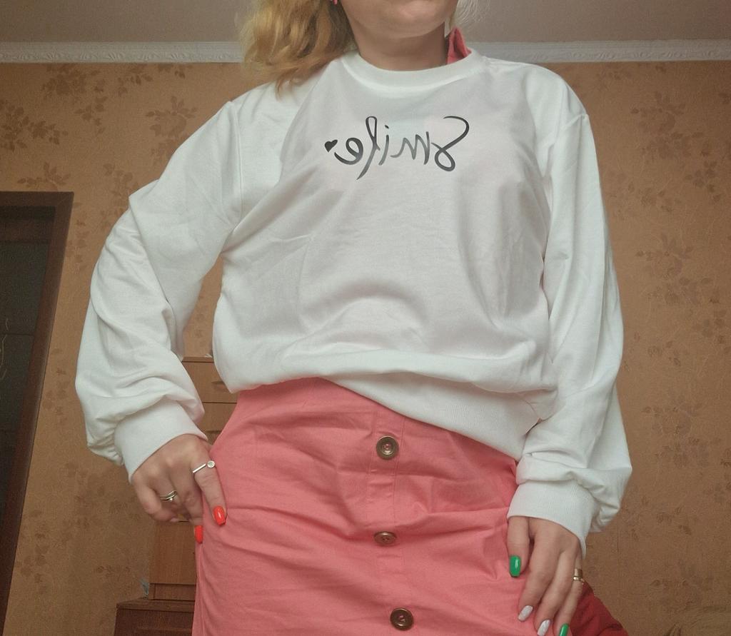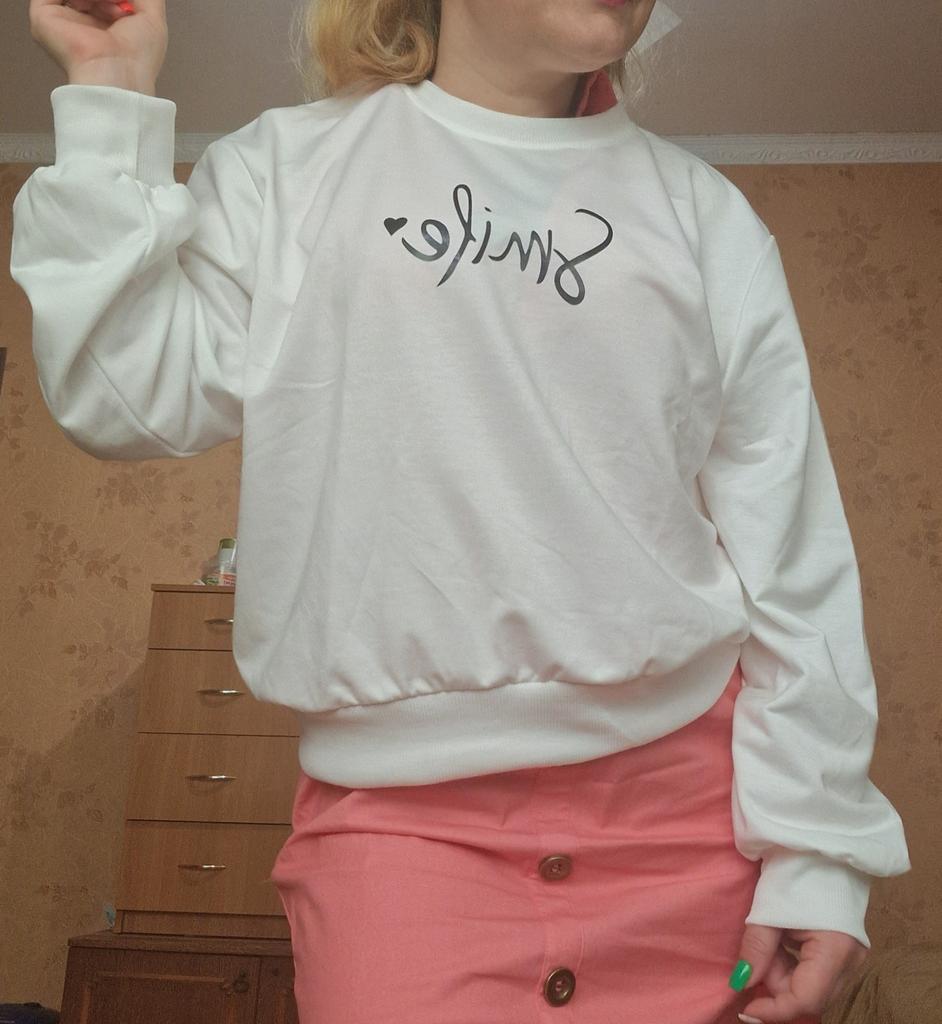 Uma blusa muito legal com uma inscrição. Minhas configurações: Altura 156 cm. Circunferência do peito 94, sob o peito. 80 cm Circunferência. cintura 74 cm. Eu uso tamanho XXL