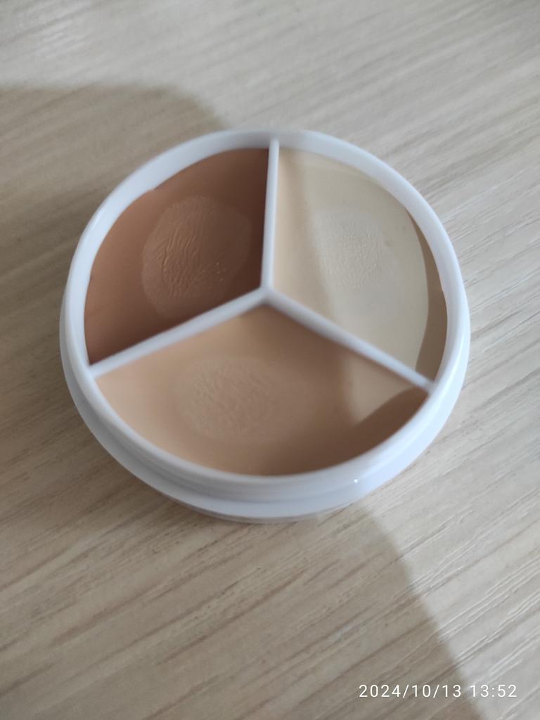 Corretivo tricolor/corretivo de 3 cores !Cuidado: contém microplásticos Bem, agradavelmente surpreso com a qualidade. É indicado, claro, para maquiagens mais pesadas, eu não usaria todos os dias, considerando que contém microplásticos, além. O corretivo apaga perfeitamente (no vídeo), mas quando oxida fica mais claro (obrigada, não fica vermelho), essa cor escura é uma grande dúvida para mim. Pode ser usado como substrato? É um pouco leve para um escultor. A princípio parecia que estava ficando amarelo. Mas, como você pode ver, ele oxida para o branco neutro. Desculpe pelo pincel no vídeo, fica melhor assim 🙂↕️ A embalagem contém informações em chinês: provavelmente instruções de uso e conteúdo. A qualidade é excelente, mas ainda estou pensando em como usá-la. Decepcionado com a cor escura.