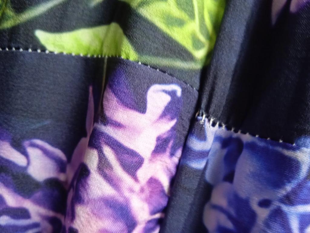 O vestido é escuro, mas costurado com fios brancos, a costura do meio da saia não combina com a costura do meio das costas. O braço está mal acabado e é muito grande