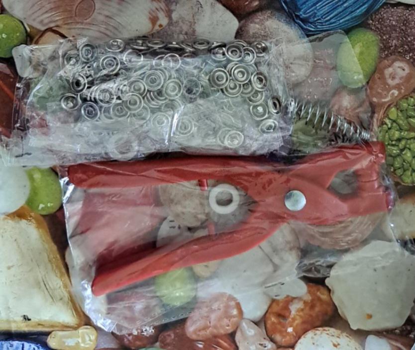 Grampos muito úteis para roupas e sapatos. São fornecidos 2 tipos distintos, um para fixação macho-macho, outro com furo para cintos ou sapatos, por onde pode passar um barbante, por exemplo. E o alicate é o ótimo complemento que permite uma montagem mais fácil e elegante.