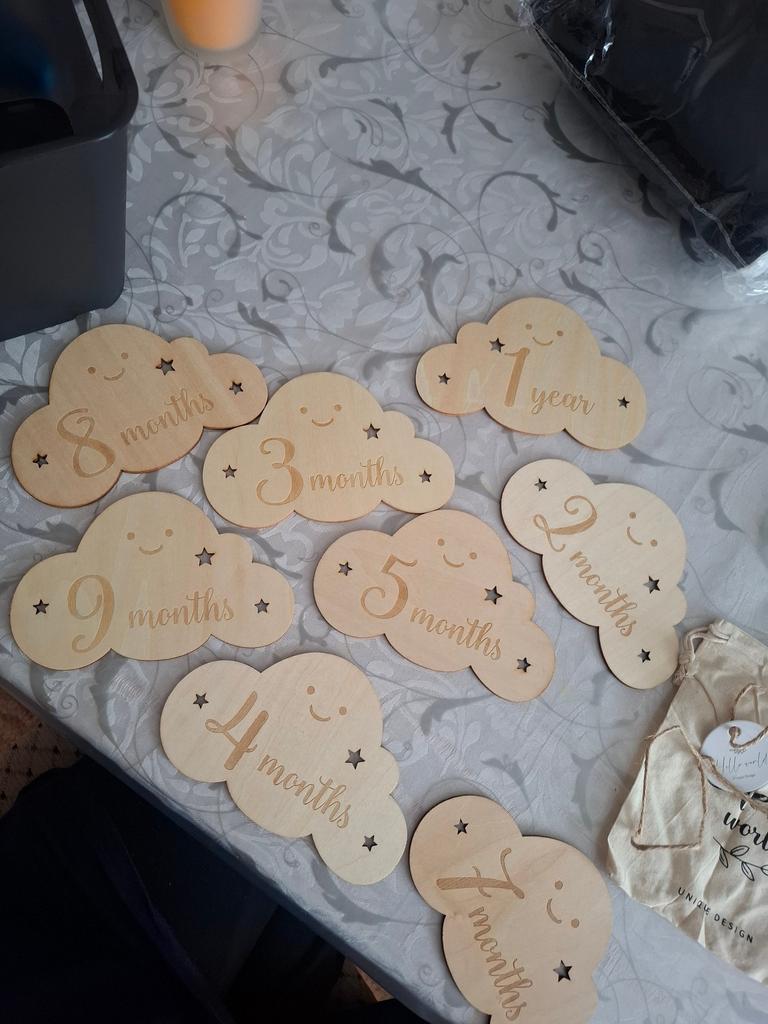 Cartão de marco de madeira para bebê, 8 peças/conjunto, para recém-nascido, formato de nuvem, adereços fotográficos, acessórios, cartões de mês, adesivo, presentes para recém-nascidos