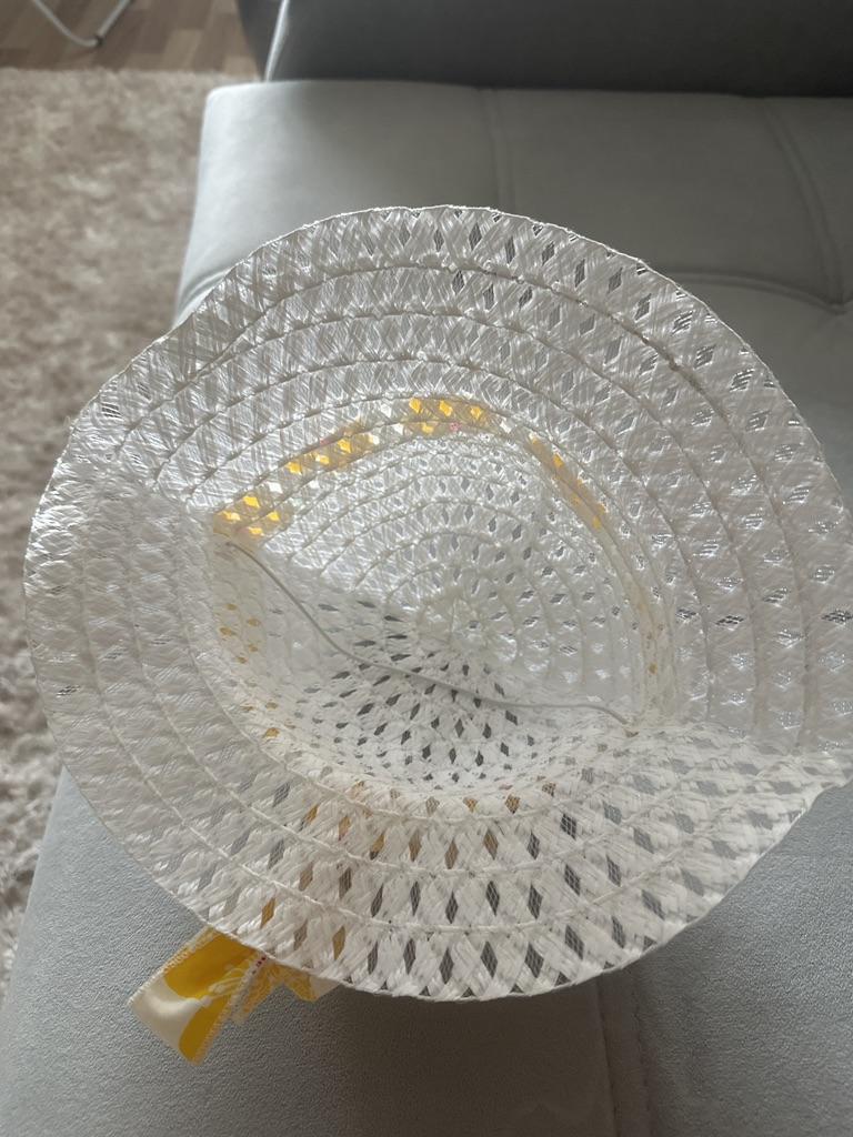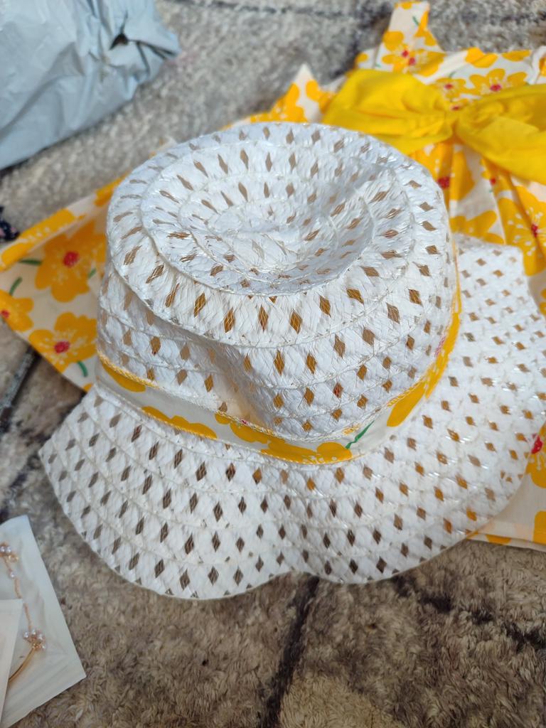 Que vestidinho fofo. Não gostei do chapéu. Está sujo por dentro e é muito grande.