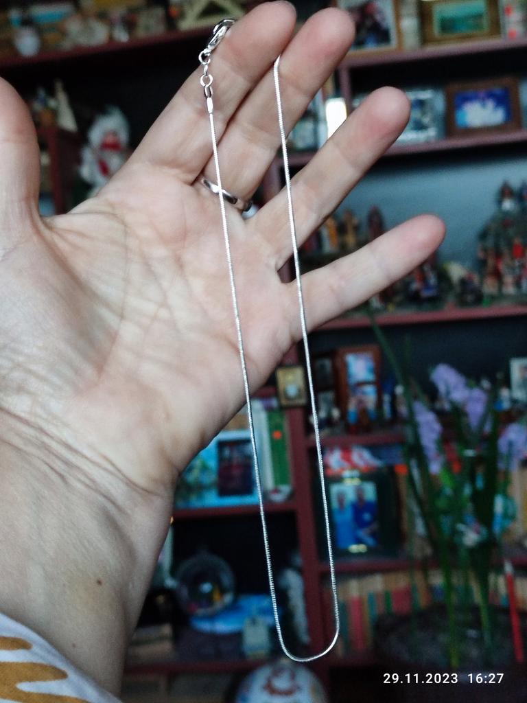 É prateado, muito bom para colocar pingentes com engastes pequenos, é longo, muito bonito