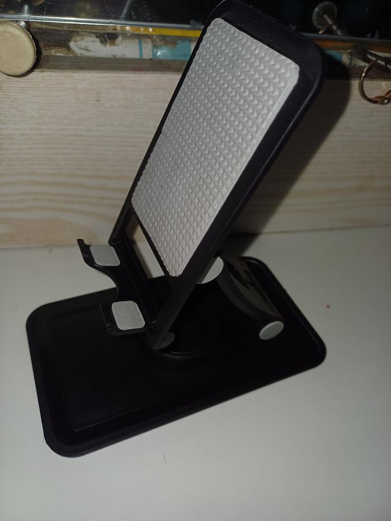 Suporte para telefone ou tablet, várias posições dobra desdobra gira, encontrei a posição certa para meu tablet que é pesado mas bom aguenta, agora é a sua vez para um pedido. Volto ao meu comentário para informar que uma vez encontrada a posição certa, os 4 círculos cinzentos são eles que bloqueiam os ajustes, a cada movimento eles ressaltam, pronto. Eu gosto.