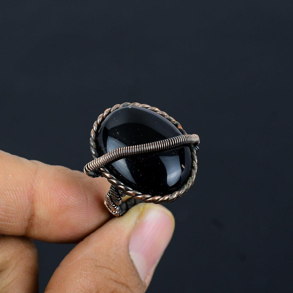 Anel de joia feito à mão com fio de cobre e pedra preciosa de ônix preto para presente
