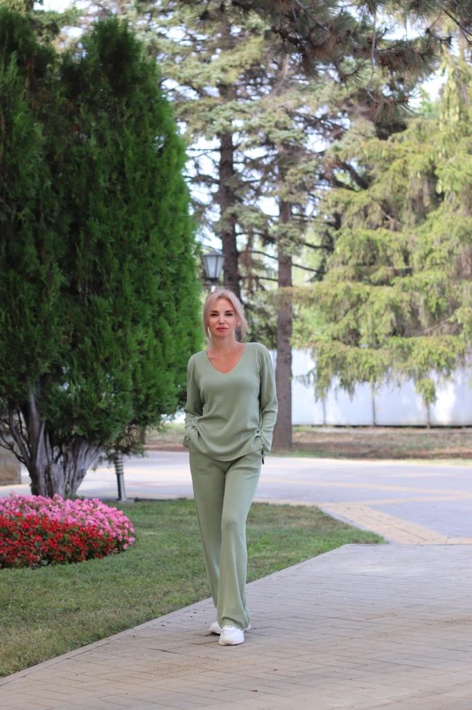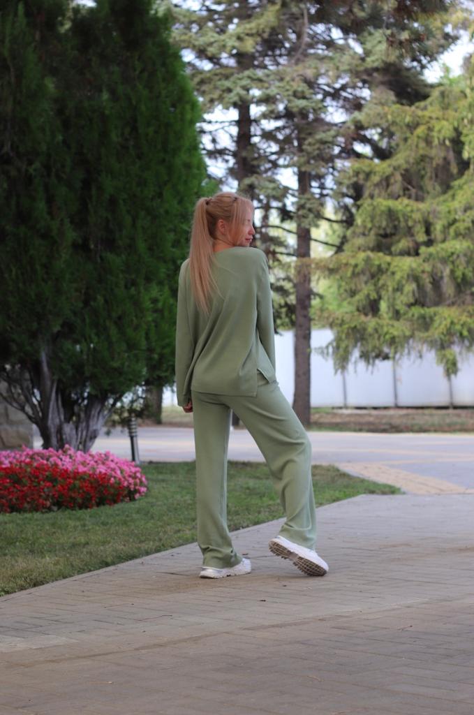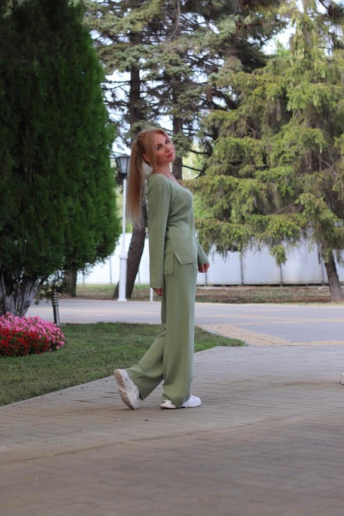 O terno é legal! As calças são compridas, o que é bom. A cor combina - verde-oliva delicado. O tecido é denso, pesado, mantém bem o formato e não amassa.. Satisfeito. Eu recomendo. Usei frequentemente, não faz bolinhas e não desfia. Após a lavagem, manteve a forma.