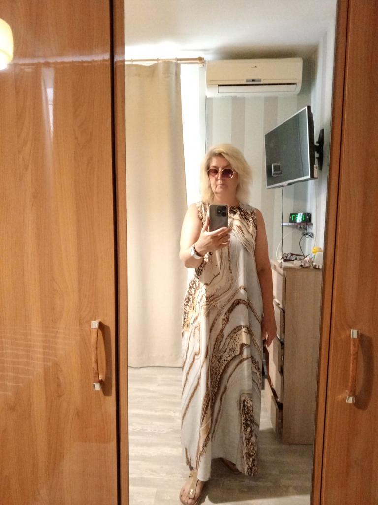 Vestido de praia fofo. Seda artificial. Usei no mar - ok. Costurado com cuidado. Sem reclamações. Comprei tamanho 50 XL.
