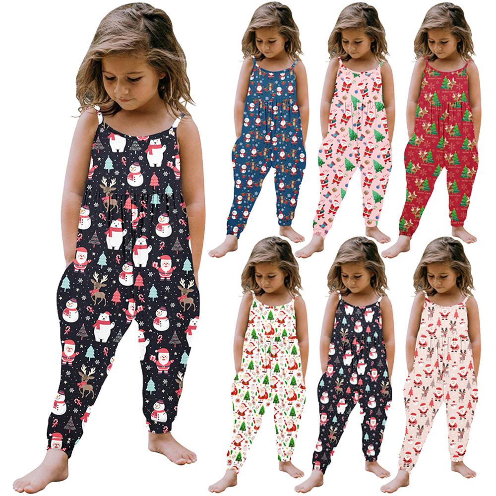 Árvore de Natal Papai Noel Rena Flocos de Neve Padrão Bebê Crianças Alças Espaguete Macacão Macacão Crianças Roupas para 1-5 Anos